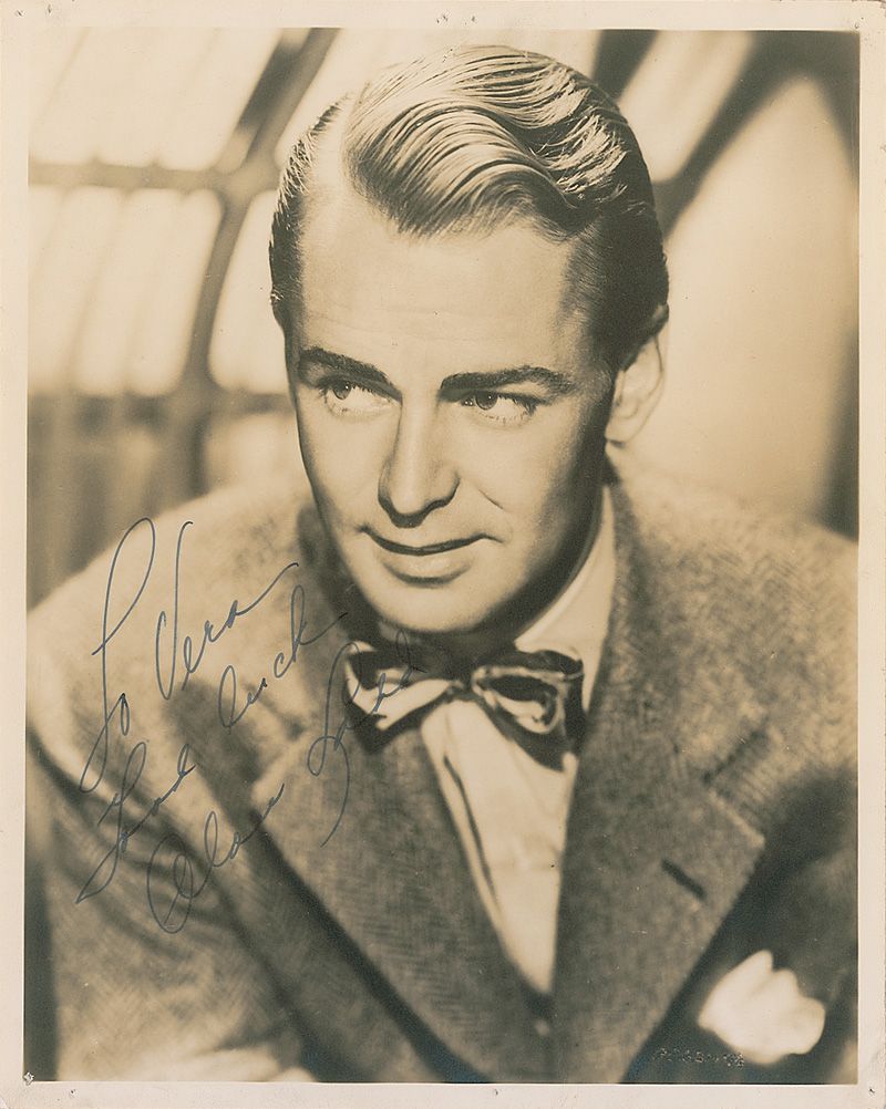 Handsome vintage matte-finish 8 x 10 photo, signed and inscribed in fountain pen “To Vera, Good luck, Alan Ladd.” In fine condition, with some light contrast to signature, staple and tack holes to top and bottom borders, and a touch of light silvering.