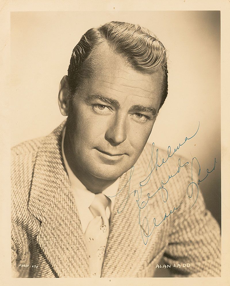 Vintage matte-finish 8 x 10 photo, signed and inscribed in fountain pen “To Thelma, Regards, Alan Ladd.” A tack hole to top and bottom edge and scattered creases, mainly to corners and edges, otherwise fine condition.