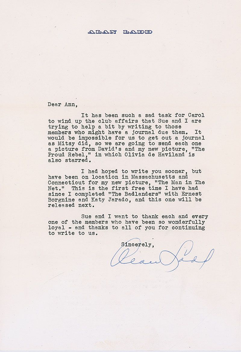 TLS, one page, 7.25 x 10.5, personal letterhead, no date, postmarked August 1, 1958. Letter to Ann Paulino, a member of his fan club. In part: “It has been such a sad task for Carol to wind up the club affairs that Sue and I are trying to help a bit by writing…we are going to send each one a picture from David’s and my new picture, ‘The Proud Rebel,’ in which Olivia de Haviland [sic] is also starred.” In fine condition. Accompanied by the original mailing envelope.