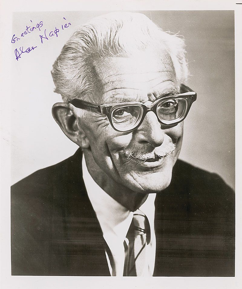 Glossy 8 x 9.5 head-and-shoulders photo of Napier wearing thick glasses, signed in purple felt tip, “Greetings, Alan Napier.” In fine condition.