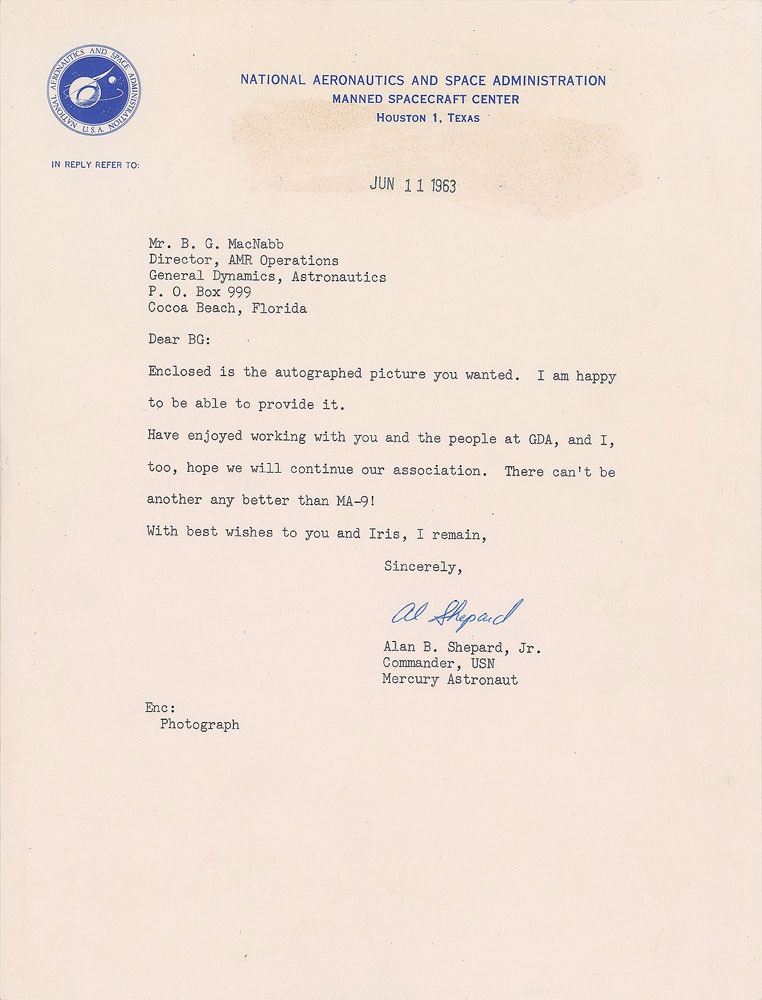 TLS signed “Al Shepard,” one page, 8 x 10.5, NASA letterhead, June 11, 1963. Letter to B. G. MacNabb, the director of AMR Operations at General Dynamics, Astronautics, in full: "Enclosed is the autographed picture you wanted. I am happy to be able to provide it. Have enjoyed working with you and the people at GDA, and I, too, hope we will continue our association. There can't be another better than MA–9! With best wishes to you and Iris." In fine condition, with slight show-through from band of adhesive to reverse.