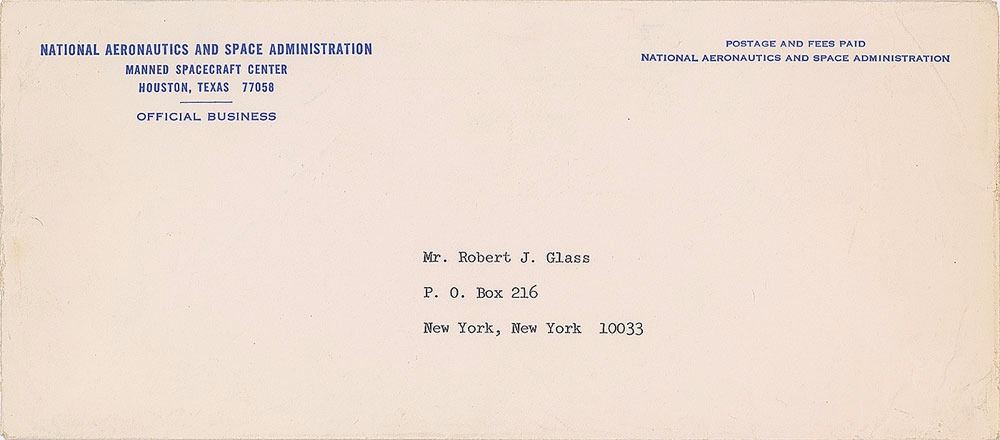TLS signed “Alan B. Shepard, Jr.,” one page, 8 x 10.5, NASA letterhead, July 26, 1967. Letter to Robert J. Glass, written during his time as chief of the Astronaut Office. In part: "It is not our policy to substitute machine autographs for authentic autographs on first day covers, collector's items, et cetera; however, we do not have a firm policy for the handling of autograph requests such as yours. The honoring of such requests must necessarily depend upon the availability of any specific astronaut. Often his work schedule and travel activities preclude his participating in these requests promptly and as often as is desirable, but he does respond graciously whenever possible. The desired autographs and your cover are enclosed together with our thanks for your patient understanding of our necessarily complex method of handling the astronauts' autograph requests." In fine condition. Accompanied by the original mailing envelope. An intriguing letter offering insight into NASA's handling of the numerous autograph requests sent to astronauts during the early Apollo era.