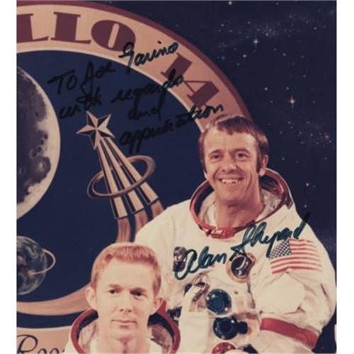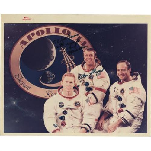 <B>Alan Shepard Signed Color Photograph,</B></I> 10" x 8", "<I>To Joe Garino/ with regards/ and/ appreciation/ Alan Shepard.</B></I>" Pictured in the Apollo 14 crew. Shepard, the first American in space and the only Mercury astronaut to walk on the moon, died in 1998. <I>From the collection of renowned former physical trainer of the astronauts Joe Garino. This lot is accompanied by a signed certificate of authentication from Garino verifying its provenance.</B></I><BR><BR><b>Shipping:</b> Flat Material, Small (<a target="_blank" href="http://www.heritageauctions.com/common/shipping.php">view shipping information</a>)
