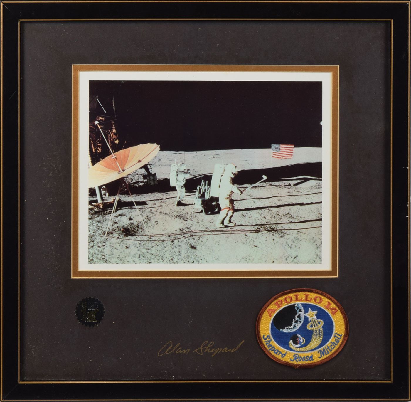 Limited edition display, framed to an overall size of 15.75 x 15.25, featuring a color glossy photo of Shepard playing golf on the lunar surface and an Apollo 14 mission patch, signed on the mat in gold ink, "Alan Shepard." Reverse of the frame bears a certificate of authenticity from the United States Historical Society, numbered 1295/2500. In fine condition.
