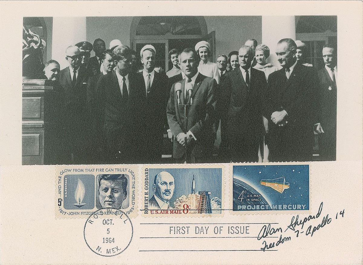 Unusual 7 x 5 philatelic card featuring an image of President John F. Kennedy and Vice President Lyndon B. Johnson with the Mercury 7 astronauts, bearing three affixed postage stamps and a first day cancellation, signed in fountain pen, “Alan Shepard, Freedom 7, Apollo 14.” In fine condition, with some creasing to upper left. Shepard’s “Freedom 7, Apollo 14” inscription is very rarely seen and highly desirable.