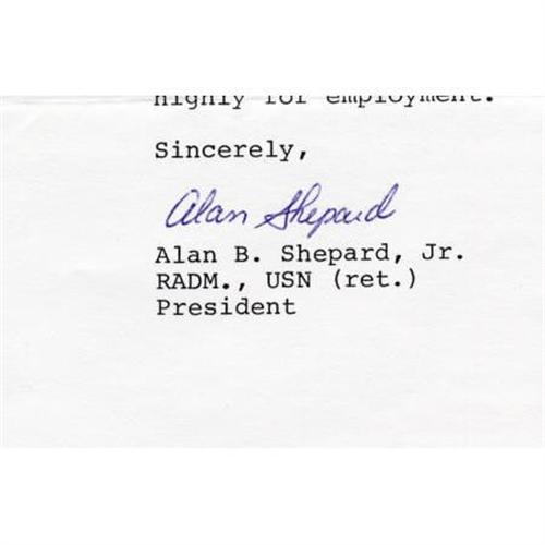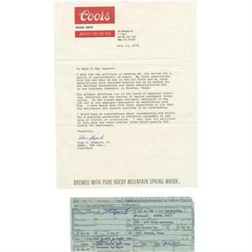 <B>Alan Shepard Signed Letters and Document</B></I> including 1978 8.5" x 11" letter of recommendation of Joe Garino signed "<I>Alan Shepard,</B></I>" plus 8.5" x 11" cover letter to Garino signed "<I>Alan</B></I>" and 7.25" x 3.25" Leave Authorization form signed "<I>Alan Shepard"</B></I> as Garino's supervisor (1966). Three items. <I>From the collection of renowned former physical trainer of the astronauts Joe Garino. This lot is accompanied by a signed certificate of authentication from Garino verifying its provenance.</B></I><BR><BR><b>Shipping:</b> Flat Material, Small (<a target="_blank" href="http://www.heritageauctions.com/common/shipping.php">view shipping information</a>)