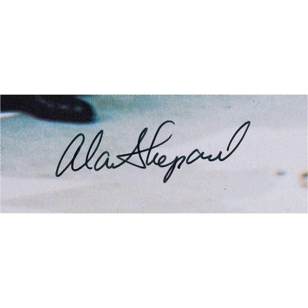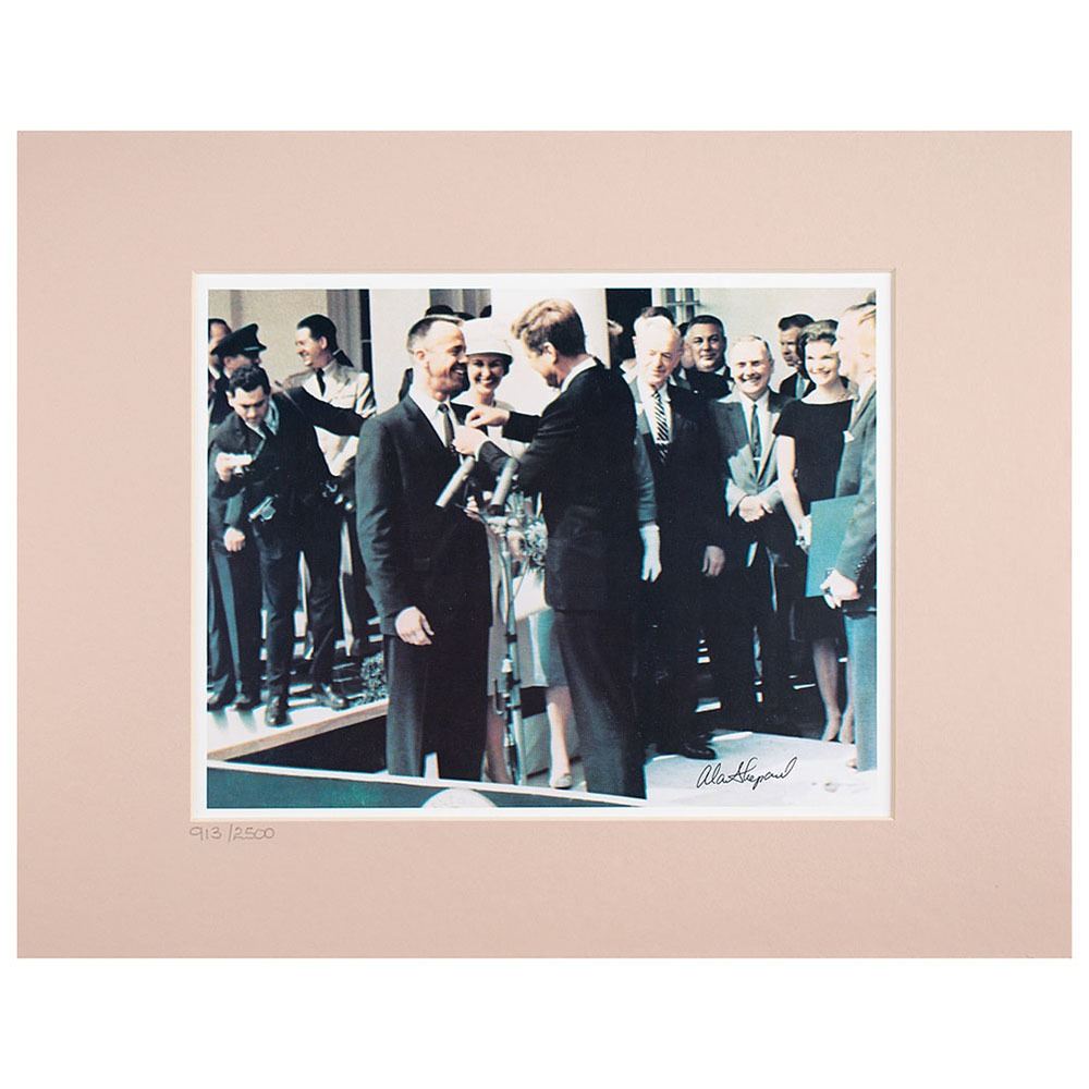 Limited edition color glossy 9.25 x 7.25 cardstock photo of Alan Shepard receiving the NASA Distinguished Service Medal from President Kennedy on May 8, 1961, signed in black ink by Shepard. Matted to an overall size of 14 x 11, with mat numbered 913/2500. In fine condition. Accompanied by an authentication sheet with matching edition number.