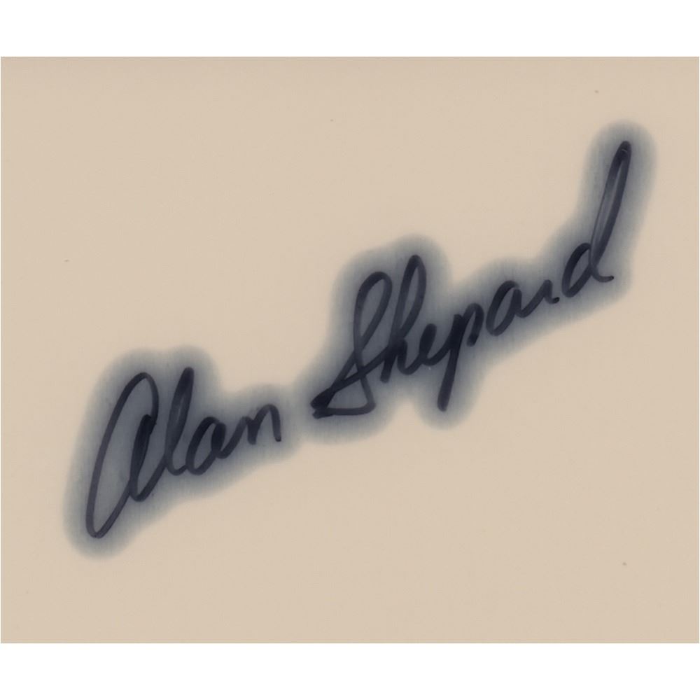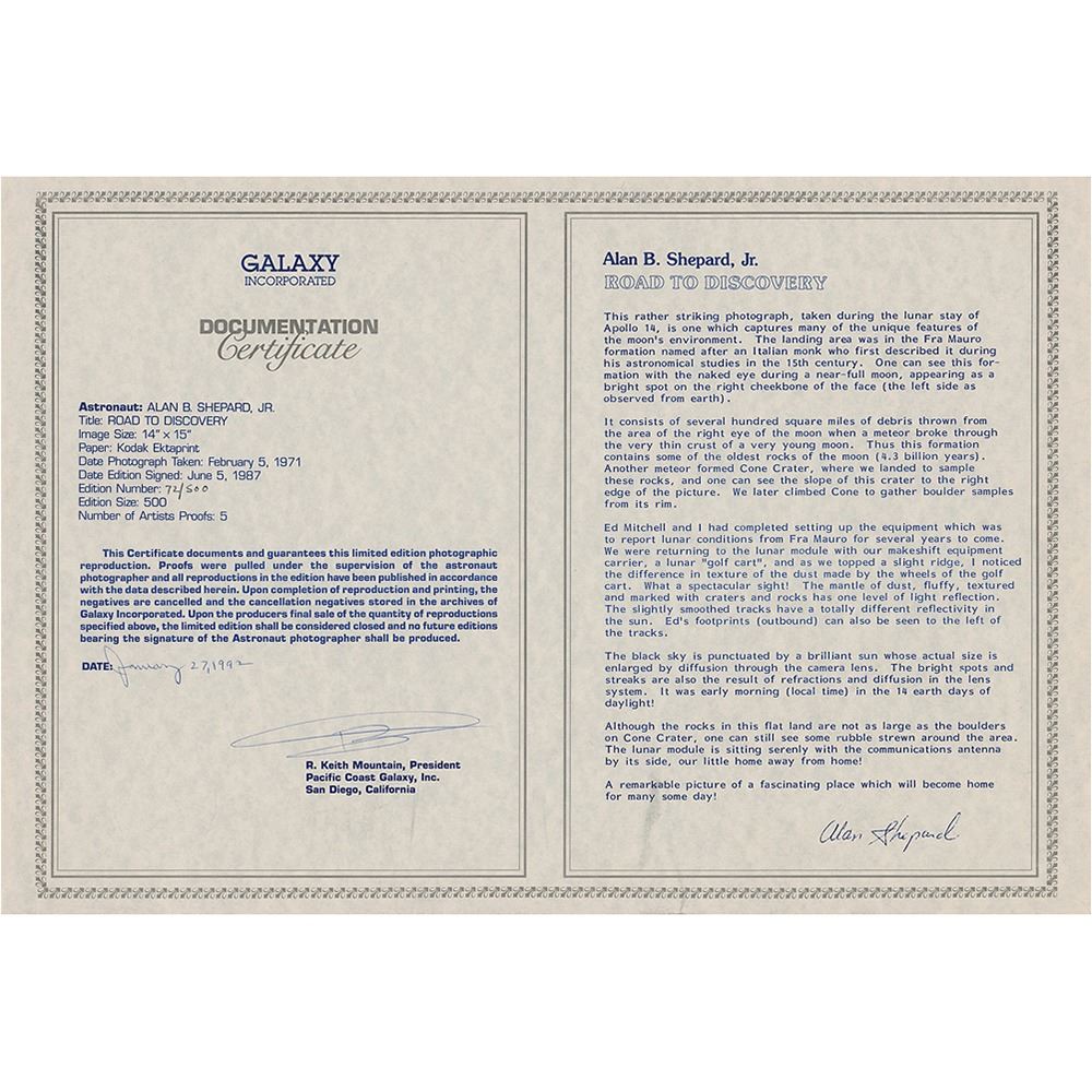 Laminated limited edition color glossy 16 x 20 photo of the reflective tracks made by the Apollo 12 equipment carrier, with the Lunar Module Intrepid visible in the distance, entitled 'Road to Discovery,' numbered 72/500, signed in the lower border in black felt tip by Alan Shepard. In fine condition, with light discoloration in the borders, and haloing to Shepard's signature due to the lamination. Accompanied by a certificate of authenticity from Galaxy Incorporated, which features a typed statement and a preprinted signature of Shepard.