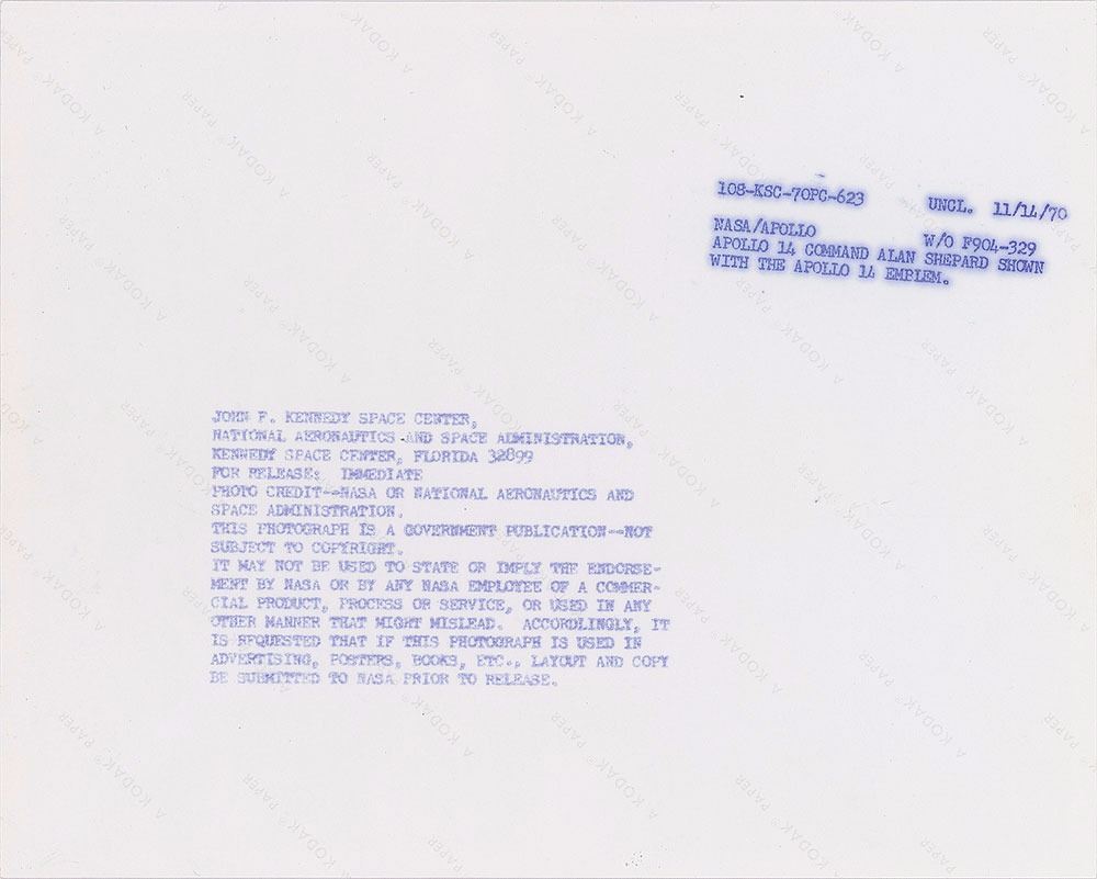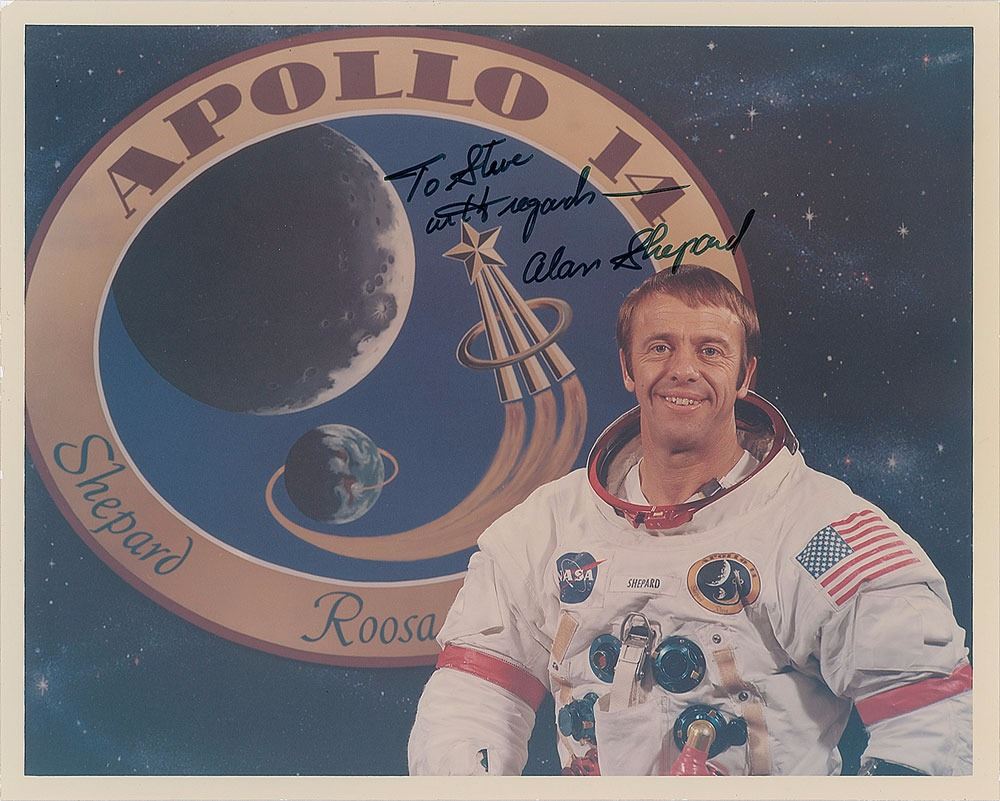 Official color glossy 10 x 8 NASA photo of Shepard posing in his white space suit against a starry backdrop and the Apollo 14 mission insignia, signed and inscribed in black felt tip, "To Steve, with regards—Alan Shepard.” Reverse bears “A Kodak Paper” watermarks and purple NASA caption text. In fine condition.
