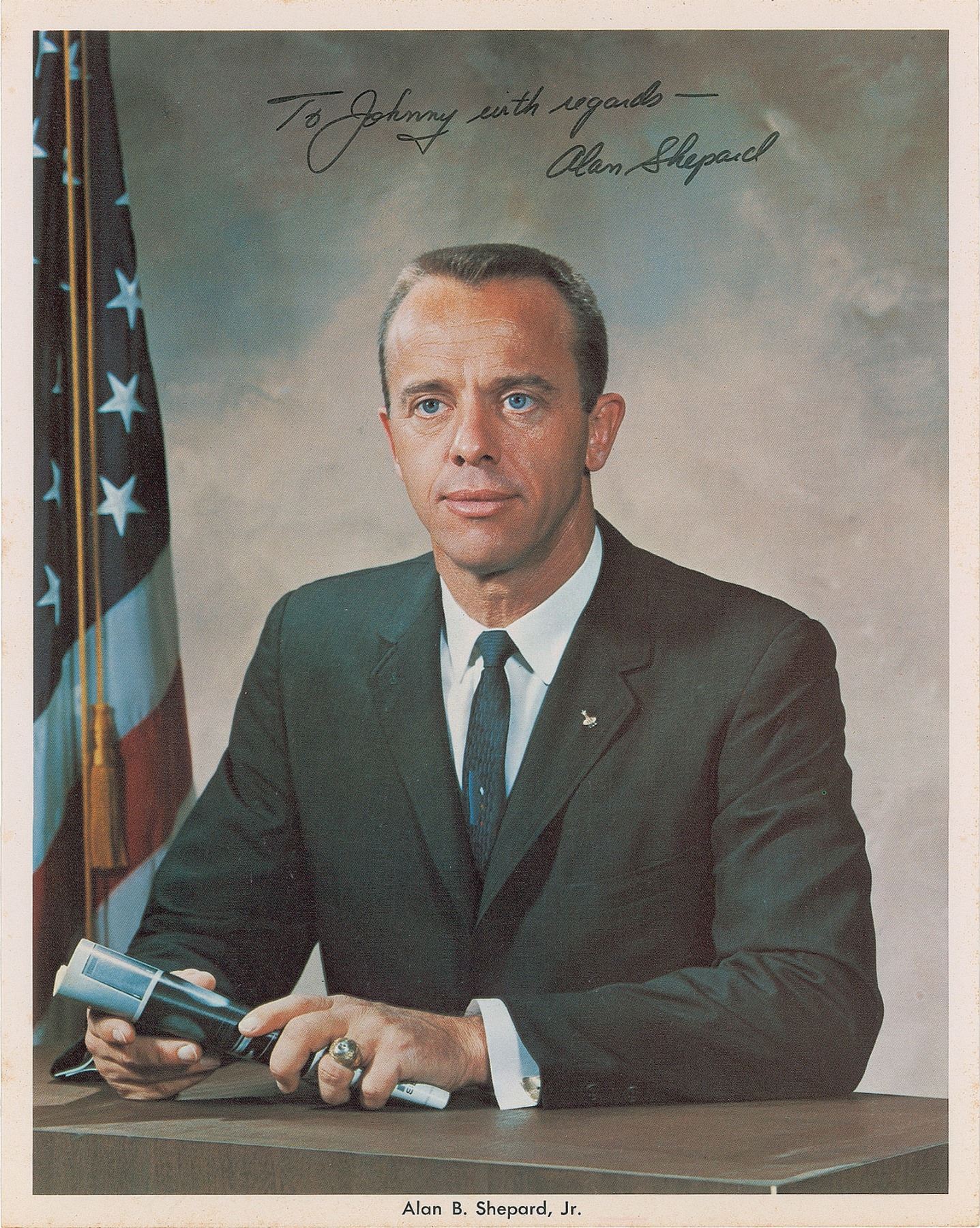 Official color 8 x 10 NASA lithograph of the Freedom 7 pilot in a formal half-length pose, signed and inscribed in black felt tip, "To Johnny with regards—Alan Shepard.” In very fine condition. An early, uncommon portrait of the first American in space.