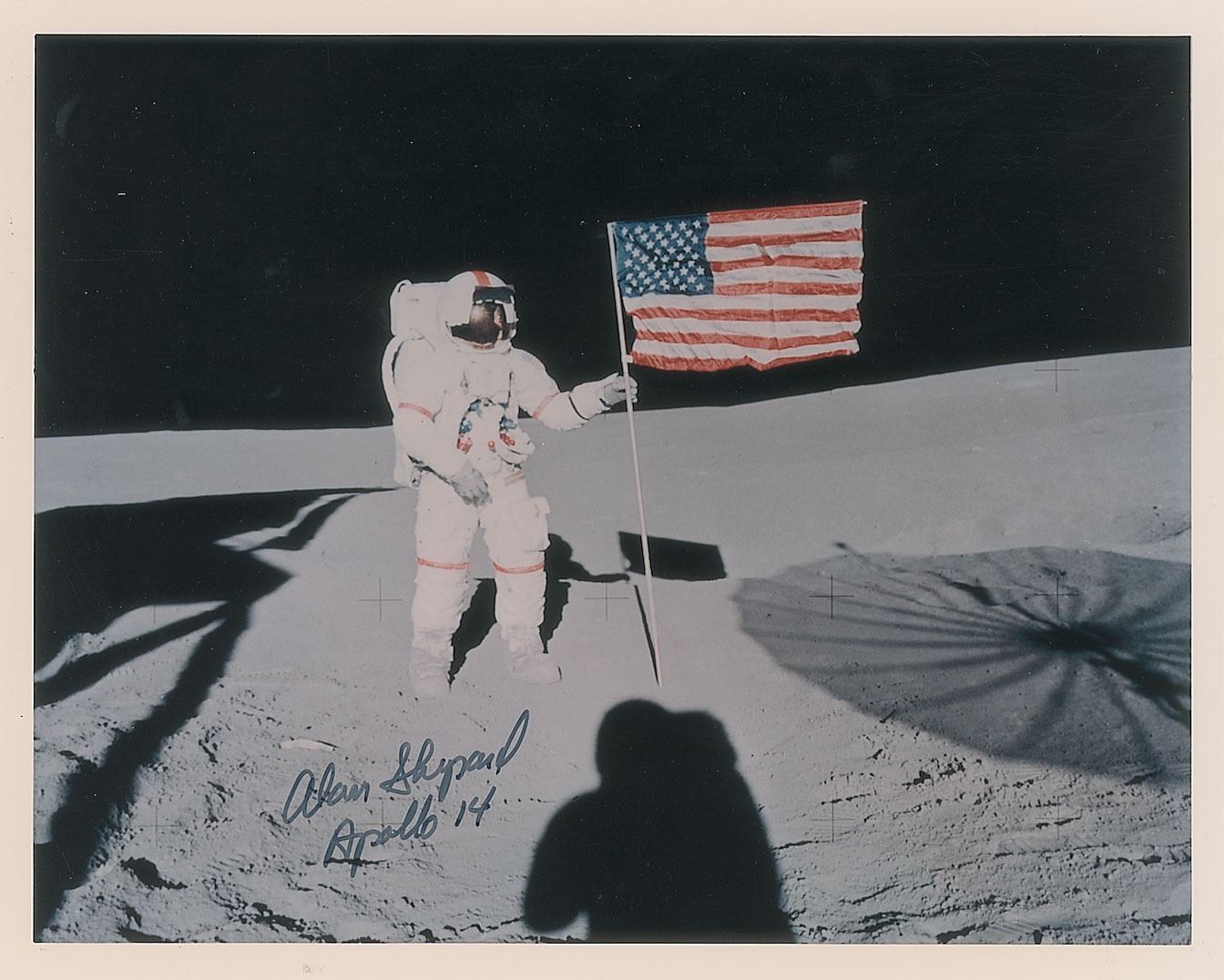 Color semi-glossy 10 x 8 full-length photo of CDR Shepard holding the American flag on the lunar surface, signed in black felt tip, "Alan Shepard, Apollo 14." In very fine condition.