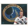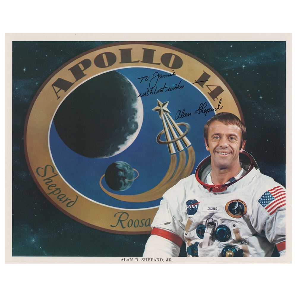 Official color 10 x 8 NASA lithograph of CDR Shepard posing in his white space suit against the Apollo 14 mission insignia, signed and inscribed in black felt tip, "To Jamie, with best wishes—Alan Shepard.†In very fine condition.