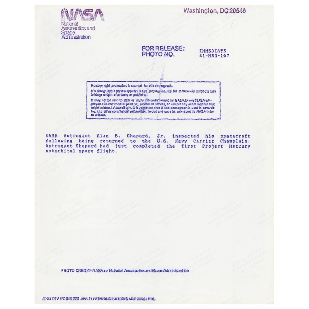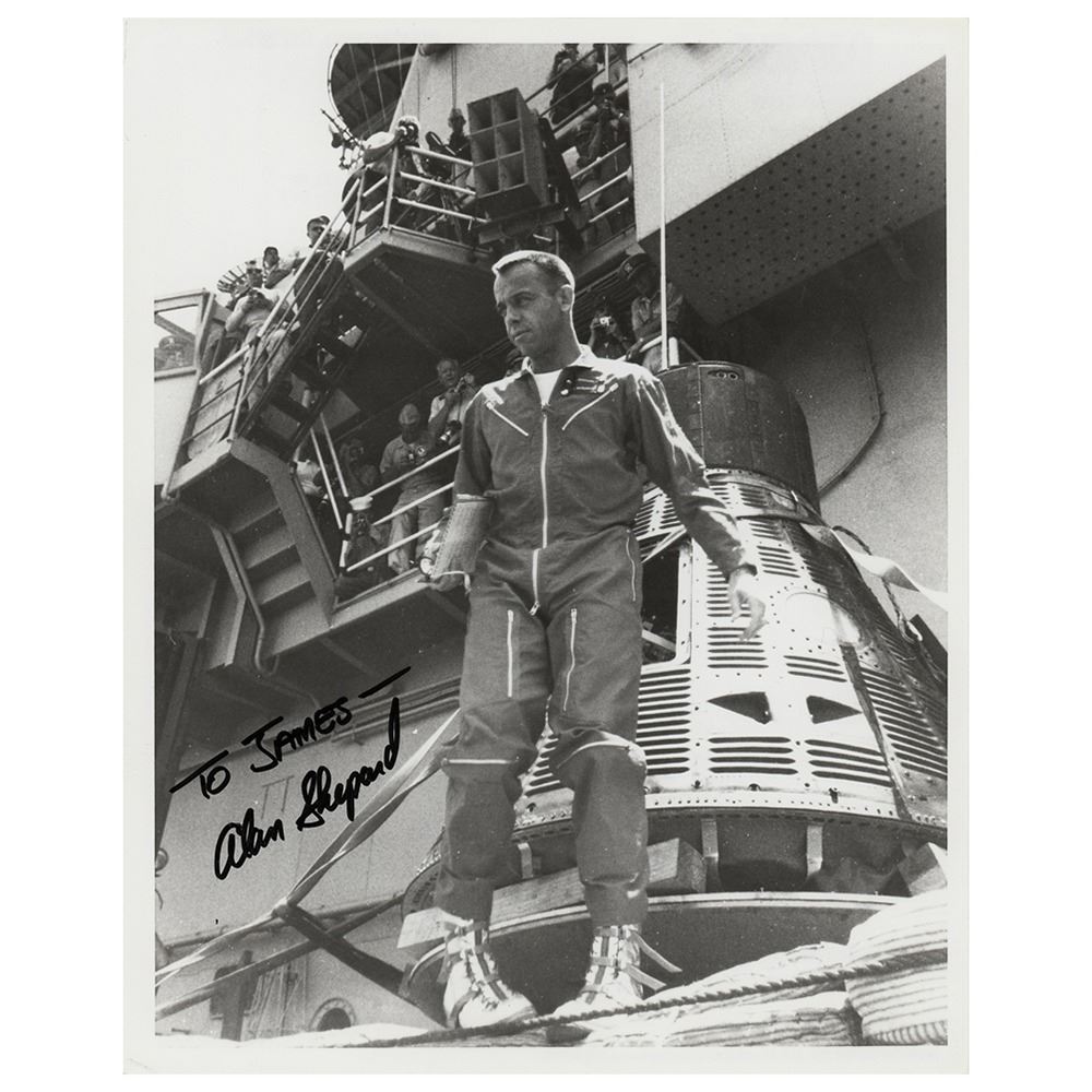 Official glossy 8 x 10 NASA photo of Shepard with his Freedom 7 capsule after recovery from the historic first Project Mercury flight, signed and inscribed in black felt tip, "To James—Alan Shepard.†Reverse bears purple NASA caption text and "This Paper Manufactured by Kodak" watermarks. In fine condition.