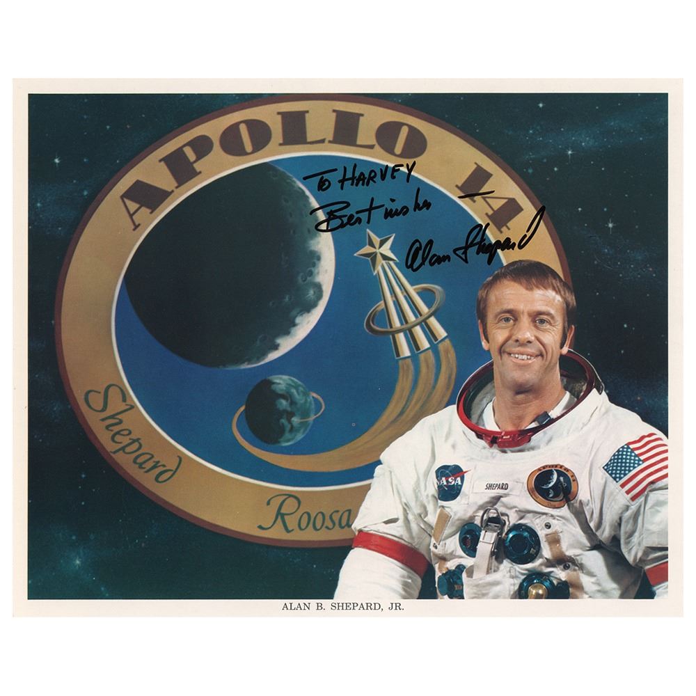 Official color 10 x 8 NASA lithograph of CDR Shepard posing in his white space suit against the Apollo 14 mission insignia, signed and inscribed in black felt tip, "To Harvey, Best wishes—Alan Shepard.†In very good to fine condition, with scattered surface creases.