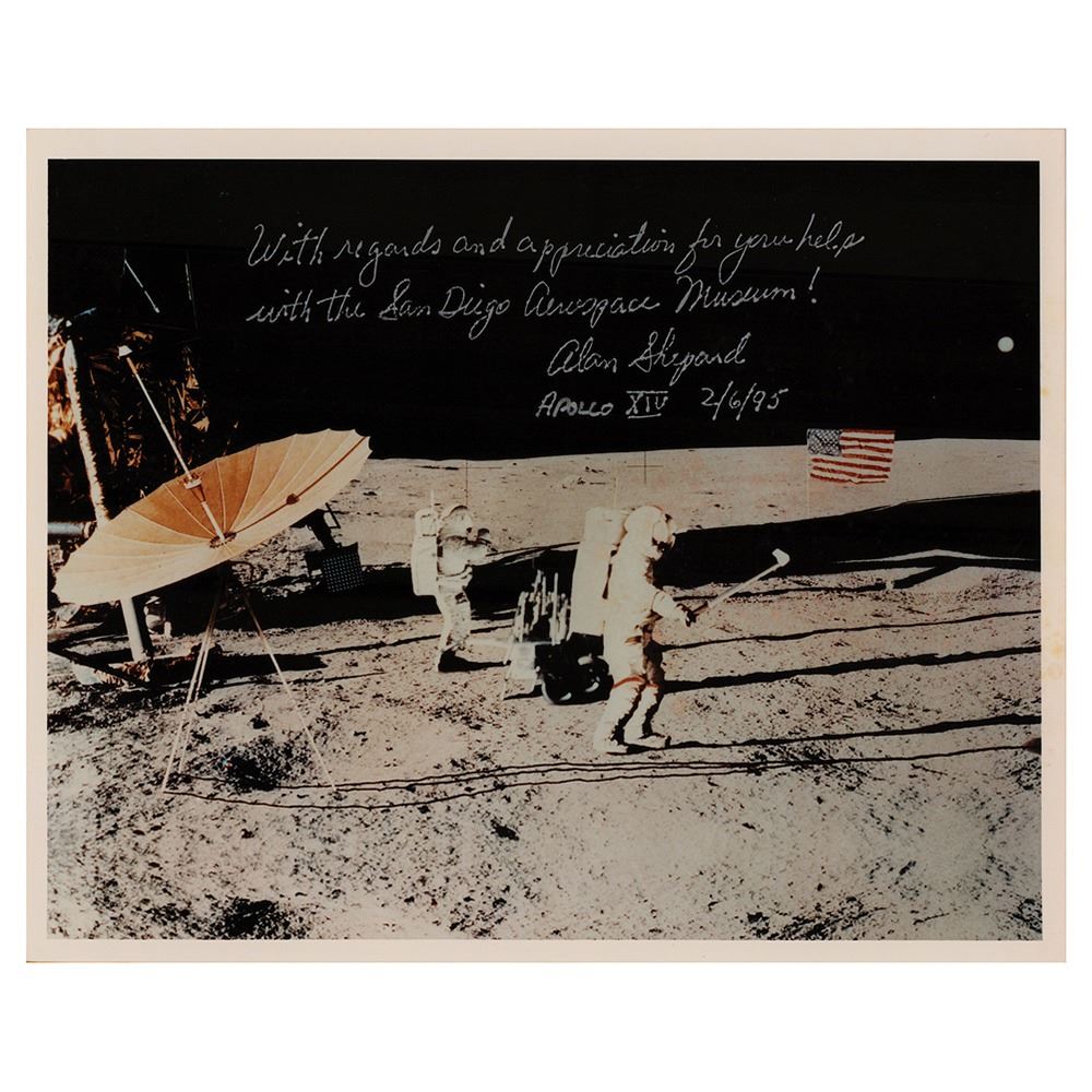 Iconic color glossy 10 x 8 photo of Apollo 14 CDR Alan Shepard playing golf on the moon, signed and inscribed in silver ink, "With regards and appreciation for your help with the San Diego Aerospace Museum! Alan Shepard, Apollo XIV, 2/6/95.‰Û In fine condition, with a light crease to the lower right edge. Accompanied by a full letter of authenticity from Zarelli Space Authentication.