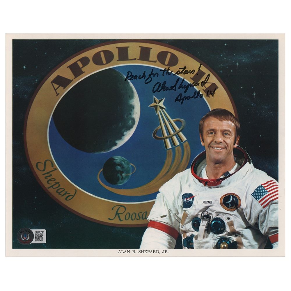 Official color 10 x 8 NASA lithograph of Alan Shepard posing in his white space suit in front of the Apollo 14 insignia, signed in black felt tip, "Reach for the stars! Alan Shepard, Apollo 14." In fine condition, with a few small surface creases and a Beckett label affixed to the lower left corner. Accompanied by a certificate of authenticity from Beckett Authentication Services.