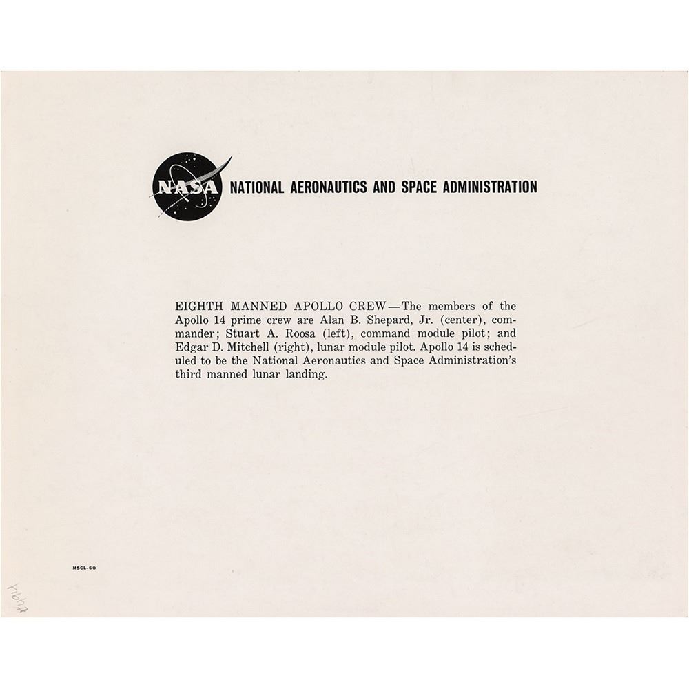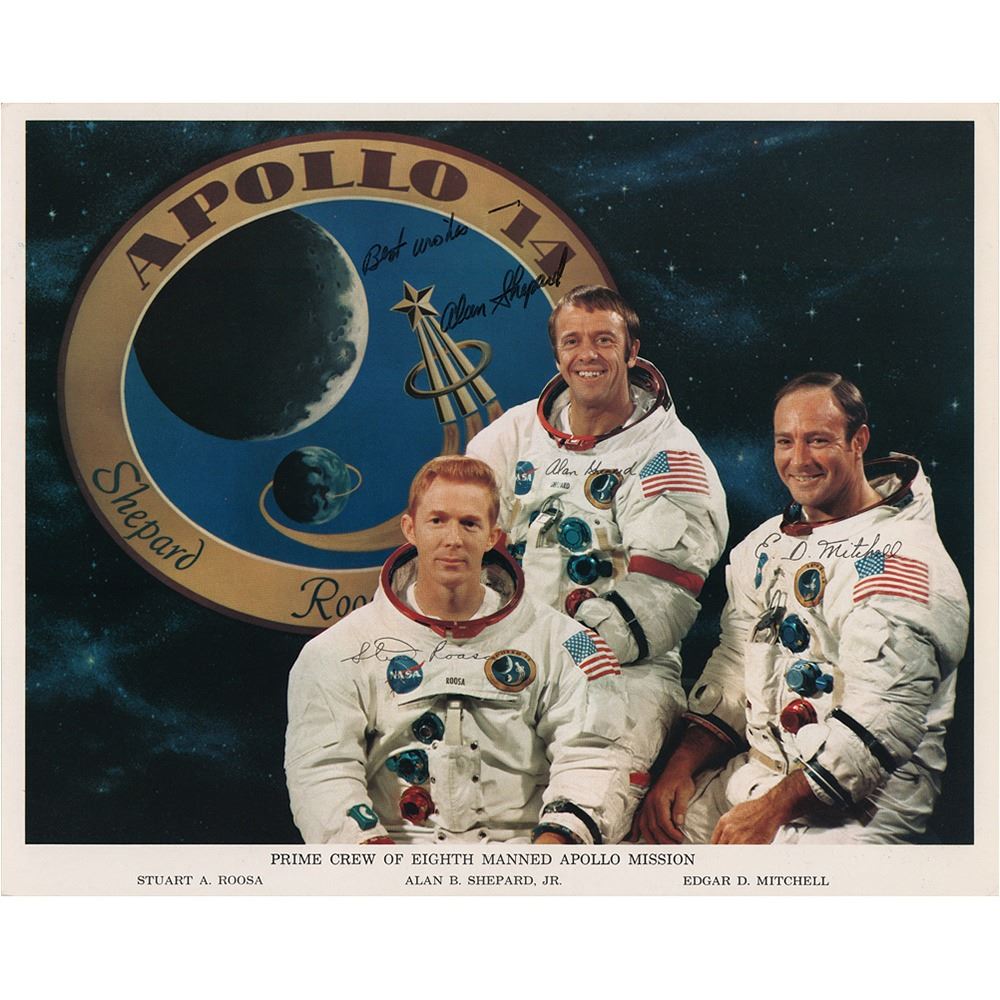 Official color 10 x 8 NASA lithograph of the Apollo 14 crew posing in their white space suits against an outer space and mission insignia backdrop, signed in black ink, "Best wishes‰ÛÓAlan Shepard." The photo also bears uncommon small reproduced autopen signatures of each crew member. In very good to fine condition, with scattered light creasing.