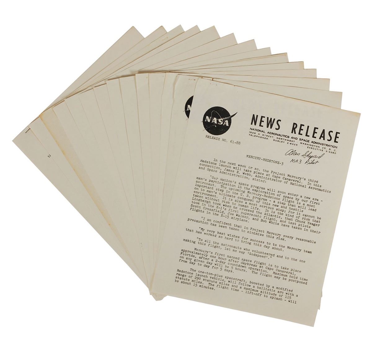 Original official NASA news release press kit for Mercury-Redstone 3, 38 pages, 8 x 10.5, April 26, 1961, signed on the cover sheet in black felt tip, “Alan Shepard, MR3 Pilot.” The press kit is divided into eleven sections detailing the first manned Mercury sub-orbital flight. In fine condition, with expected wear including a couple rusty paperclip marks. Consignor notes that this was signed at a private signing in the mid-1990s at the US Astronaut Hall of Fame in Titusville, Florida; this is the only known signed example of this press kit. From the collection of aerospace memorabilia specialist Ken Havekotte.