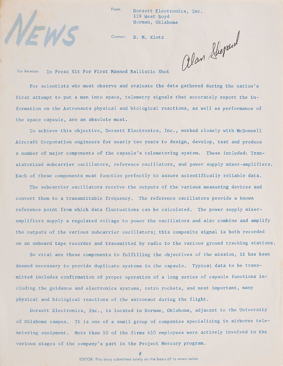 Original Dorsett Electronics press release, one page, 8.5 x 11, no date but circa 1961, signed in black felt tip, “Alan Shepard.” Press released entitled “In Press Kit For First Manned Ballistic Shot,” describing the telemetry data gathering systems the company designed for NASA. Includes a 17 x 11 sheet showing a diagram of the Mercury-Redstone 3 instrument panel consoles. In fine condition. From the collection of aerospace memorabilia specialist Ken Havekotte.