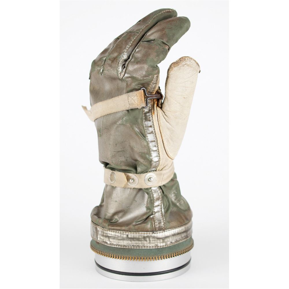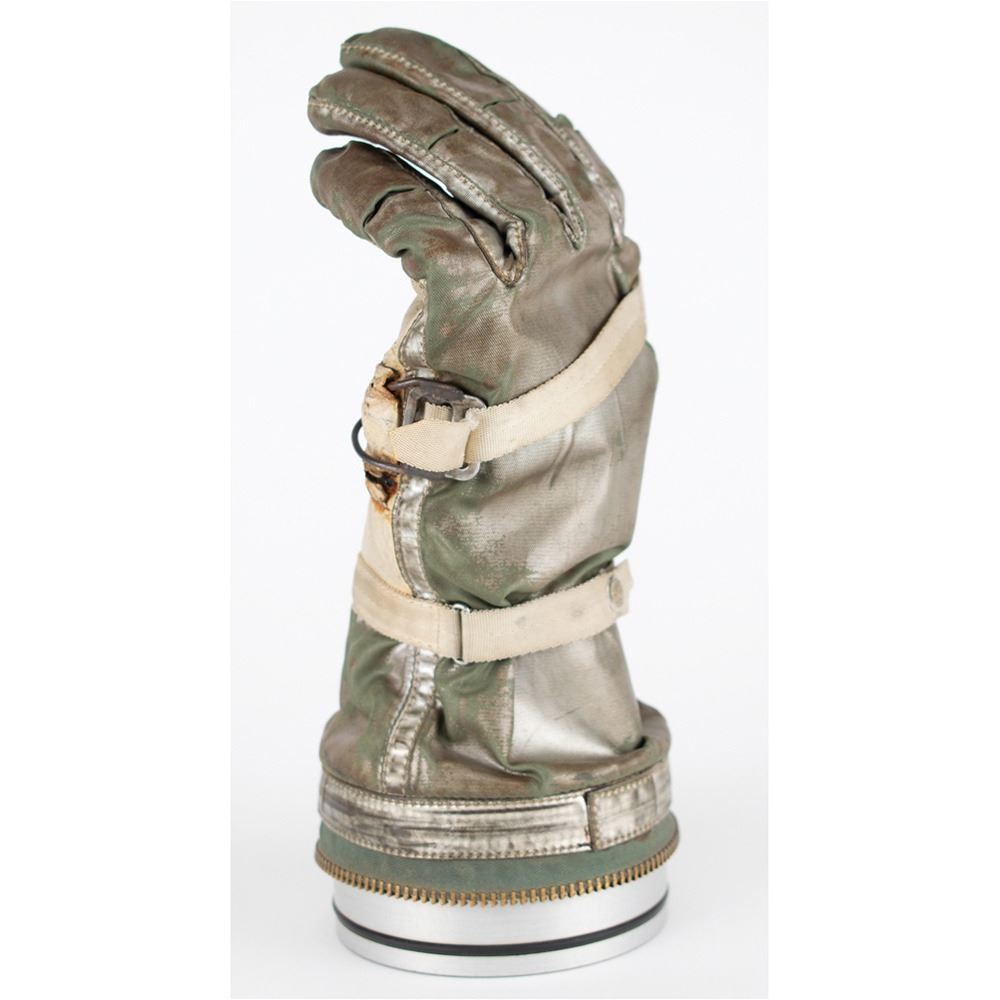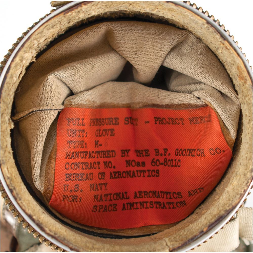 Rare Project Mercury 'Type M' testing/training left-handed space suit glove built for Mercury-Redstone 3 pilot Alan Shepard, constructed from aluminized nylon with white leather palm and thumb. The aluminum wrist cuff features a rubber seal gasket and zipper attachment. The orange tag inside the wrist reads: "Full Pressure Suit - Project Mercury, Unit: Glove, Type: M-8, Manufactured by the B.F. Goodrich Co., Contract No. NOas 60-8011C, Bureau of Aeronautics, U.S. Navy, For: National Aeronautics and Space Administration." Marked "Shepard" in felt tip inside the wrist. In very good to fine condition, with general wear from use. Consignor notes that his father founded Graham Labs in Los Altos, which built a robot to conduct tests on the space suits; an original glossy 8 x 10 photograph of him with the robot is included.