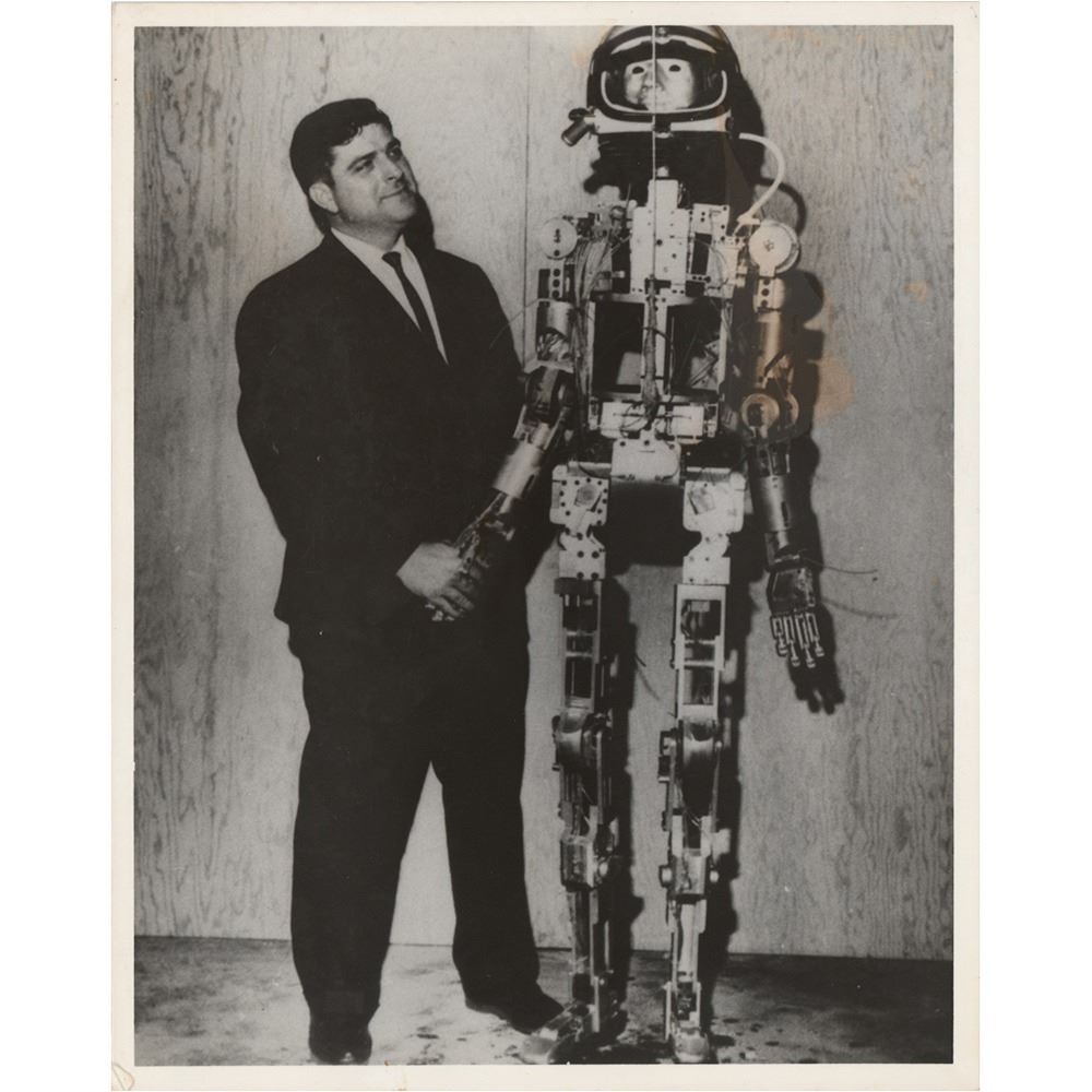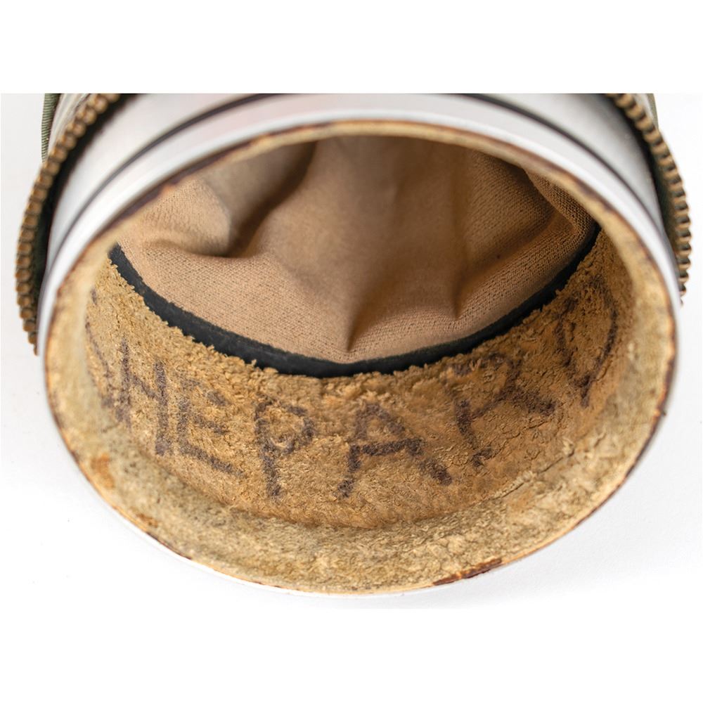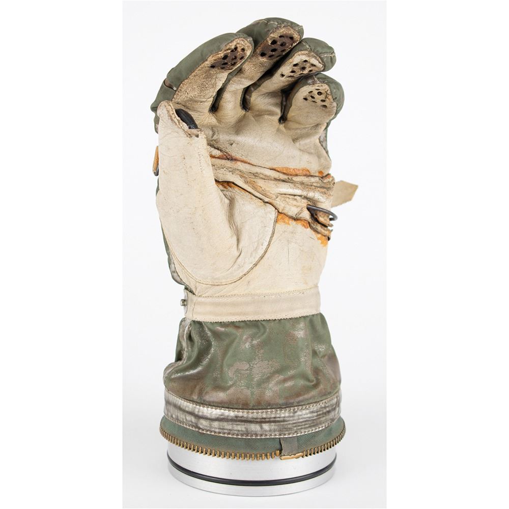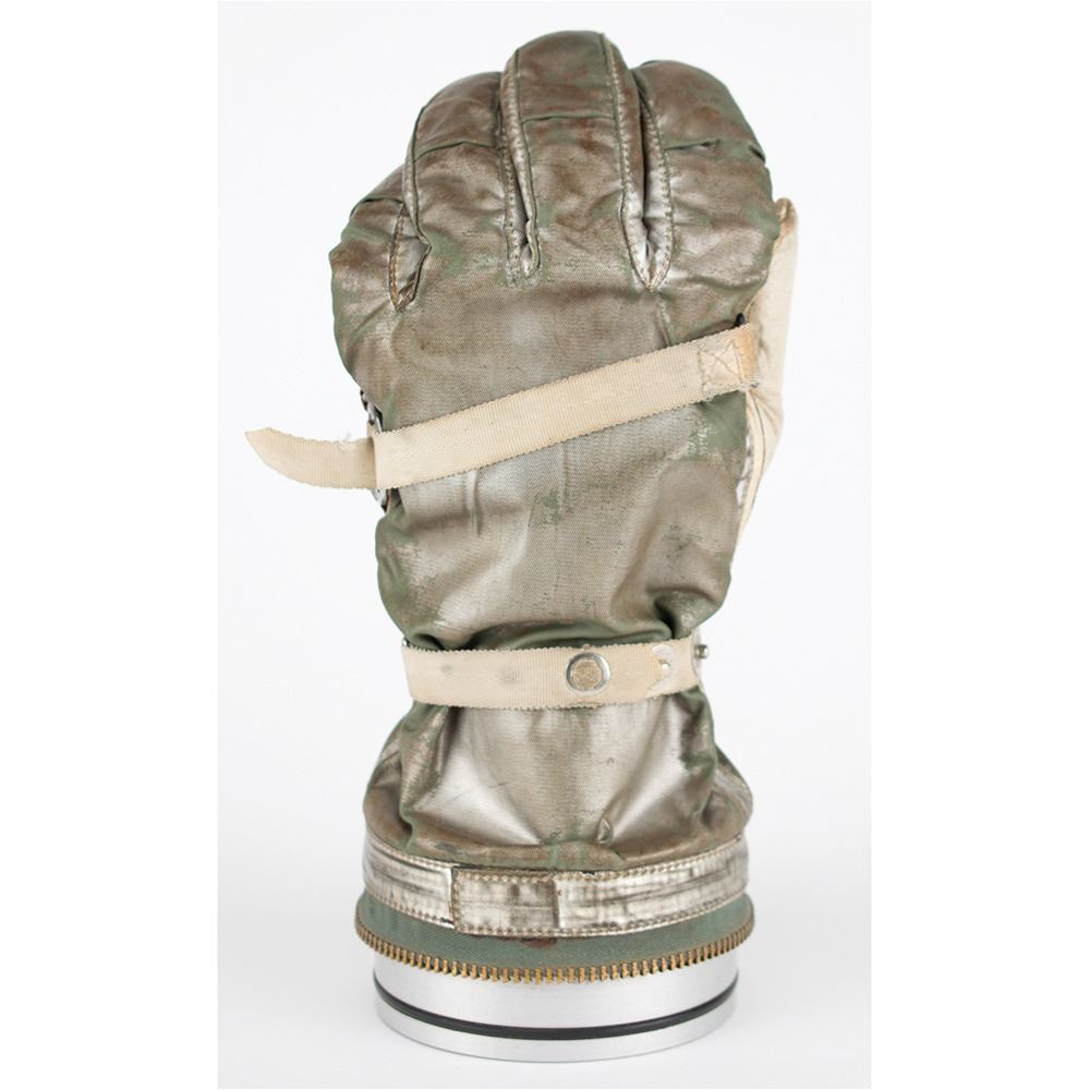 Rare Project Mercury 'Type M' testing/training left-handed space suit glove built for Mercury-Redstone 3 pilot Alan Shepard, constructed from aluminized nylon with white leather palm and thumb. The aluminum wrist cuff features a rubber seal gasket and zipper attachment. The orange tag inside the wrist reads: "Full Pressure Suit - Project Mercury, Unit: Glove, Type: M-8, Manufactured by the B.F. Goodrich Co., Contract No. NOas 60-8011C, Bureau of Aeronautics, U.S. Navy, For: National Aeronautics and Space Administration." Marked "Shepard" in felt tip inside the wrist. In very good to fine condition, with general wear from use. Consignor notes that his father founded Graham Labs in Los Altos, which built a robot to conduct tests on the space suits; an original glossy 8 x 10 photograph of him with the robot is included.