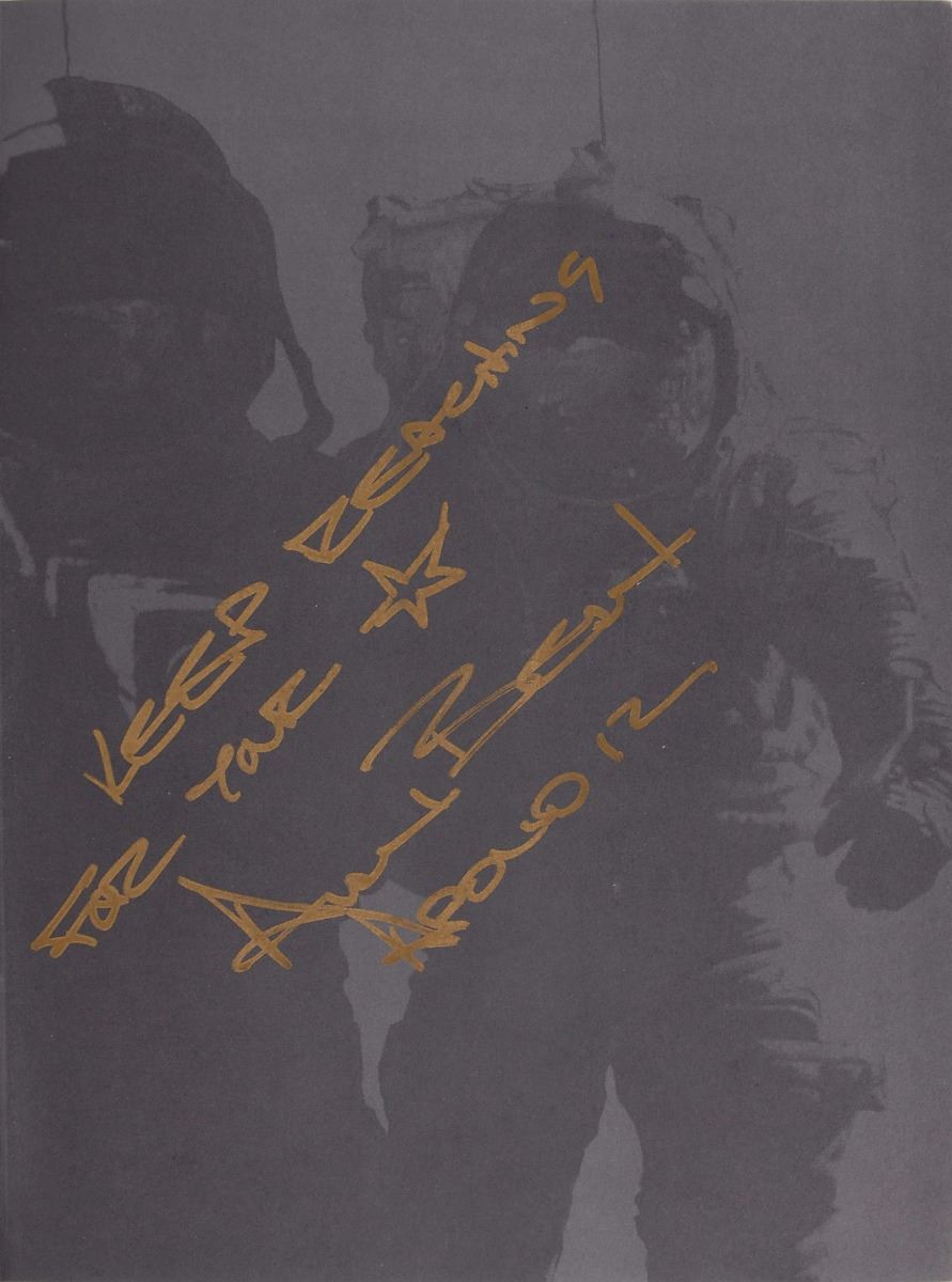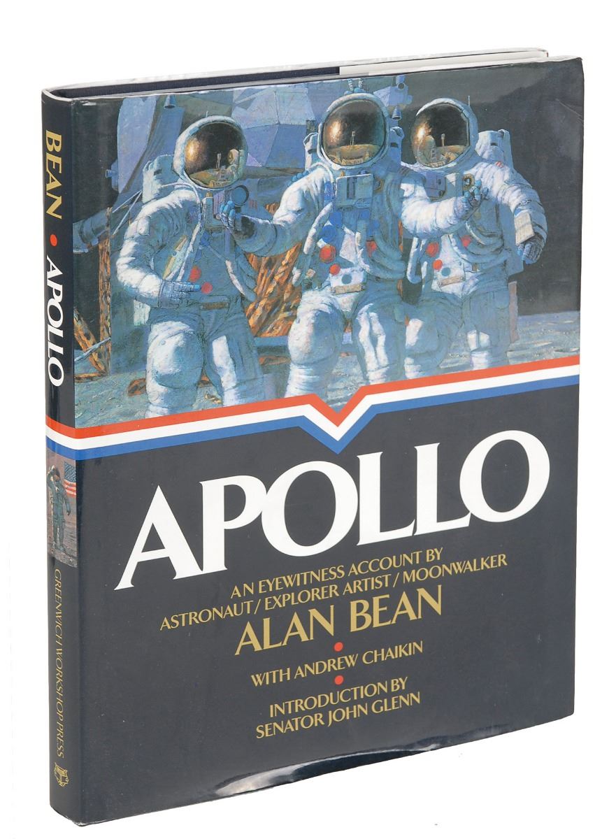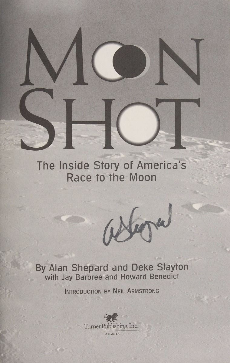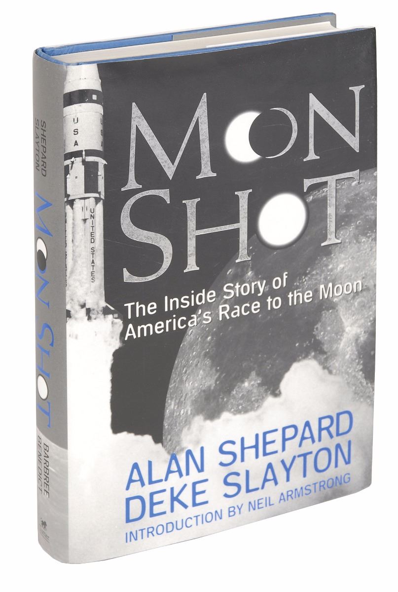 Two books: a first edition of Moon Shot, hardcover with dust jacket, signed on the title page in black felt tip, “A. Shepard”; and a first printing of Apollo, hardcover with dust jacket, signed on the first free end page in gold ink, “Keep reaching for your [star], Alan Bean, Apollo 12.” In overall fine condition.