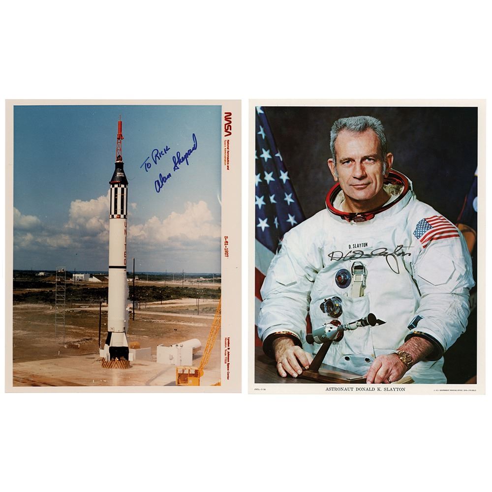 Two signed photographs of Mercury astronauts: an official color satin-finish 8 x 10 red-numbered NASA photo of the MR-3 Freedom 7 on the launchpad, signed and inscribed in blue felt tip, "To Rick, Alan Shepard"; and an official color 8 x 10 NASA lithograph of Deke Slayton in his white space suit, signed in black felt tip, "D. K. Slayton." In fine condition, with a few small surface creases to the Shepard photo.