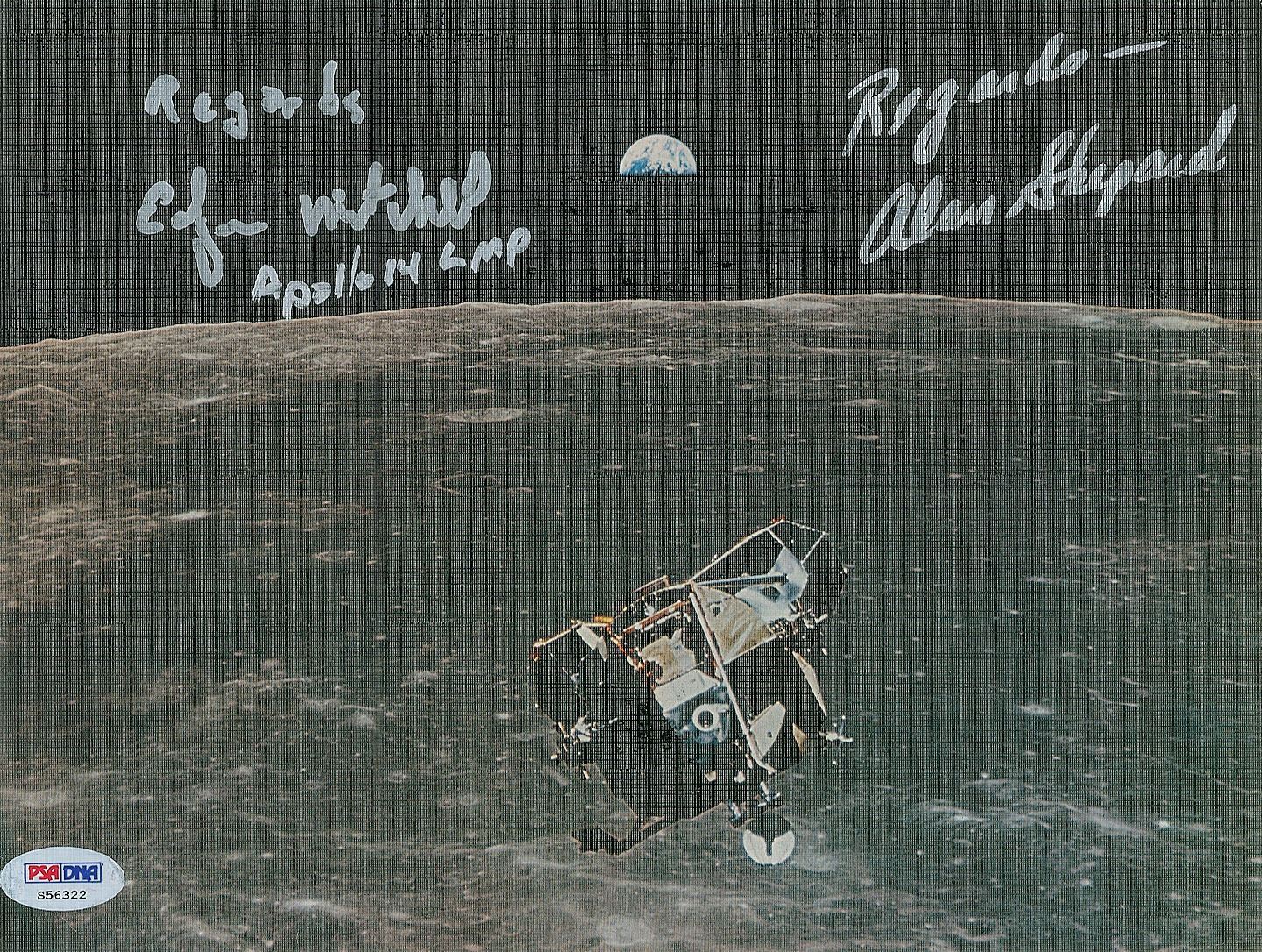Color semi-glossy 10 x 7.5 textured photo of the Lunar Module Antares ascending from the moon during the Apollo 14 mission, signed in silver ink, "Regards, Edgar Mitchell, Apollo 14 LMP" and "Regards—Alan Shepard." In very good to fine condition, with two diagonal creases passing through Shepard's signature, and a PSA/DNA label affixed to lower left corner. Accompanied by a full letter of authenticity from PSA/DNA.