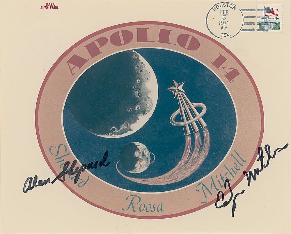 Color semi-glossy 10 x 8 ‘red-numbered’ NASA photo of the Apollo 14 mission insignia, signed in black felt tip by Alan Shepard and Edgar Mitchell. Photo also bears six-cent USPS stamp and a February 5, 1971, Houston, Texas, postal cancellation. In fine condition.