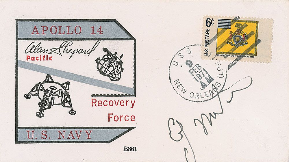 Apollo 14 commemorative cover with a cachet honoring the mission’s naval recovery force, signed in black ink and felt tip by Alan Shepard and Edgar Mitchell. In fine condition.