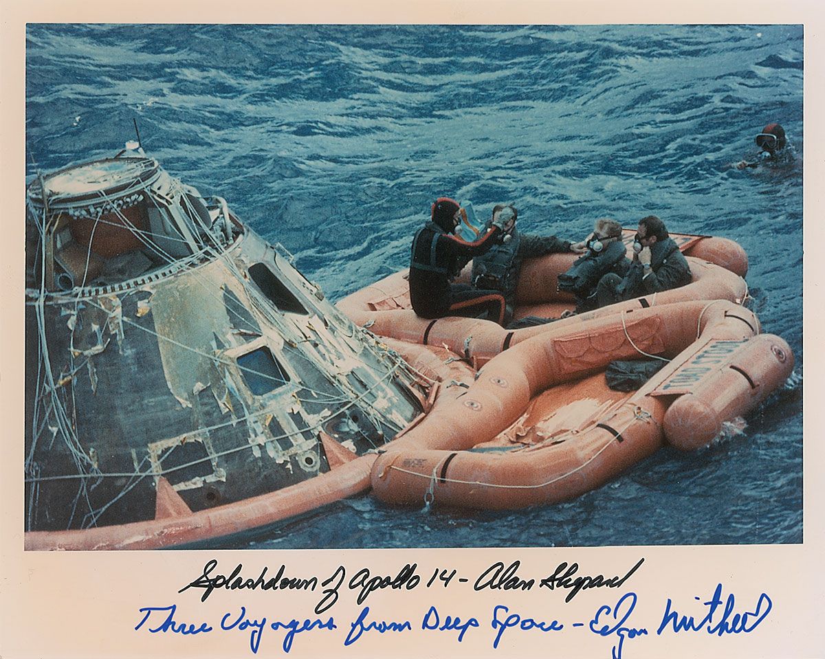 Color satin-finish 10 x 8 photo of the Apollo 14 crew in a raft shortly after splashdown, signed in the lower border in black felt tip, “Splashdown of Apollo 14—Alan Shepard,” and in blue felt tip, “Three voyagers from Deep Space—Edgar Mitchell.” In very fine condition.