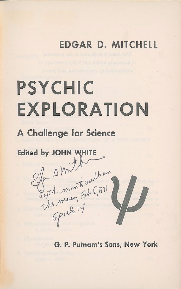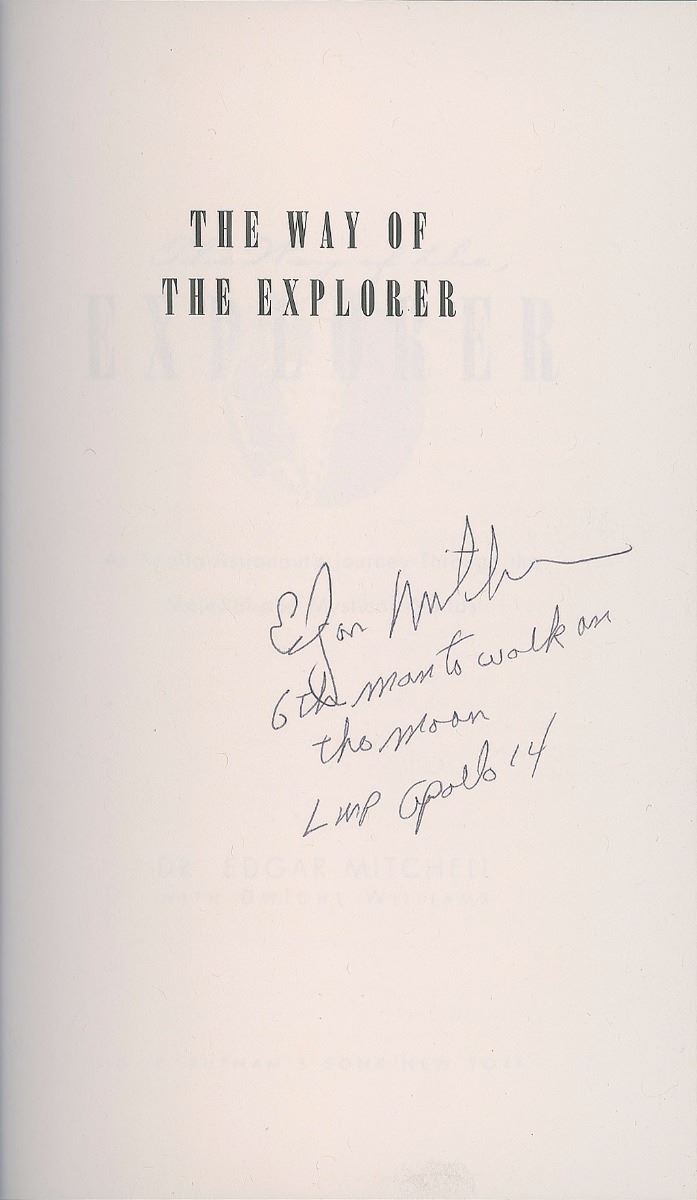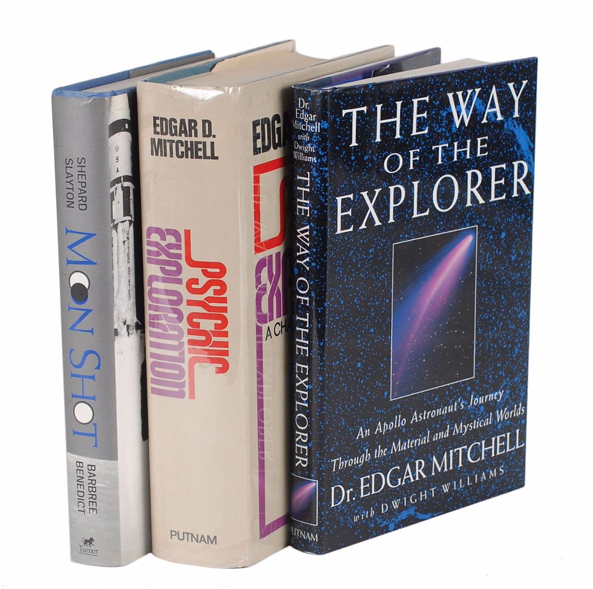 Three books: a first edition of The Way of the Explorer, hardcover with dust jacket, signed on the half-title page in black ballpoint, “Edgar Mitchell, 6th man to walk on the moon, LMP Apollo 14”; a first edition of Psychic Exploration, hardcover with dust jacket, signed on the title page in black ballpoint, “Edgar Mitchell, Sixth man to walk on the moon, Feb. 5, 1971, Apollo 14”; and a first edition of Moon Shot, hardcover with dust jacket, signed on a bookplate affixed to the first free end page in blue felt tip, “A. Shepard.” In overall fine condition, with slight soiling, creasing, and rubbing to the Psychic and Explorer dust jackets.