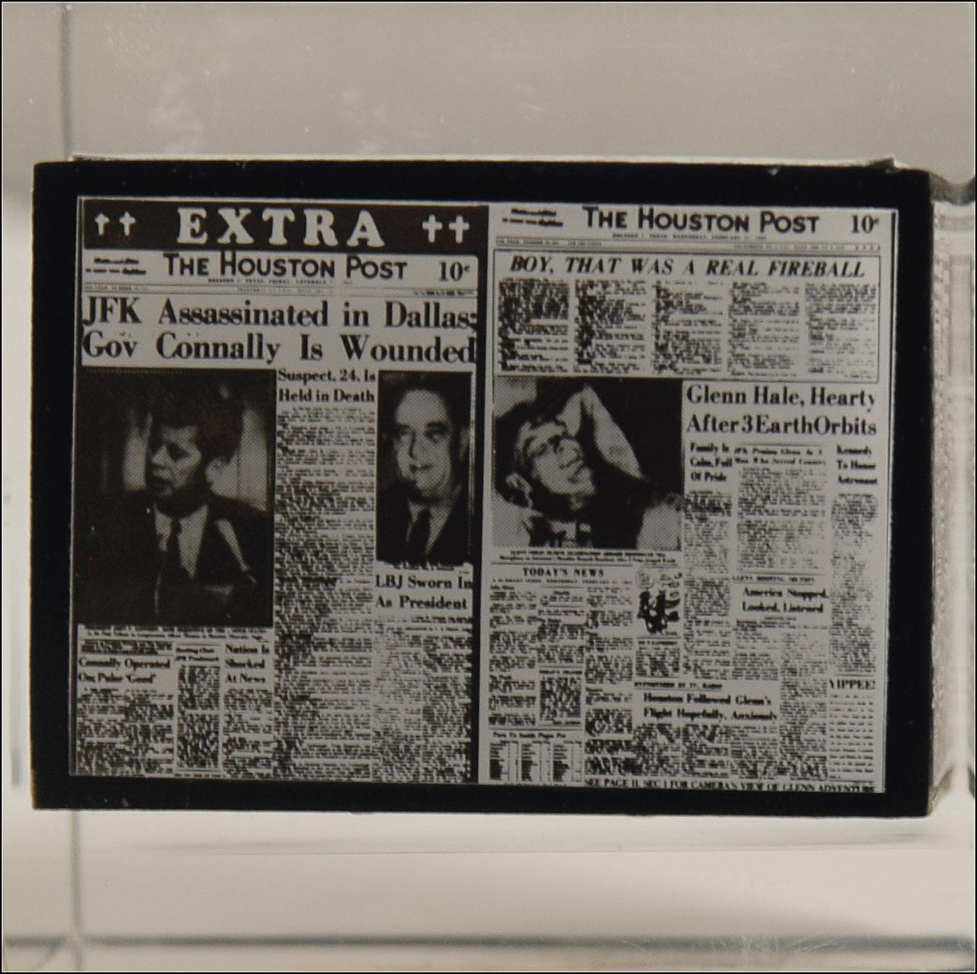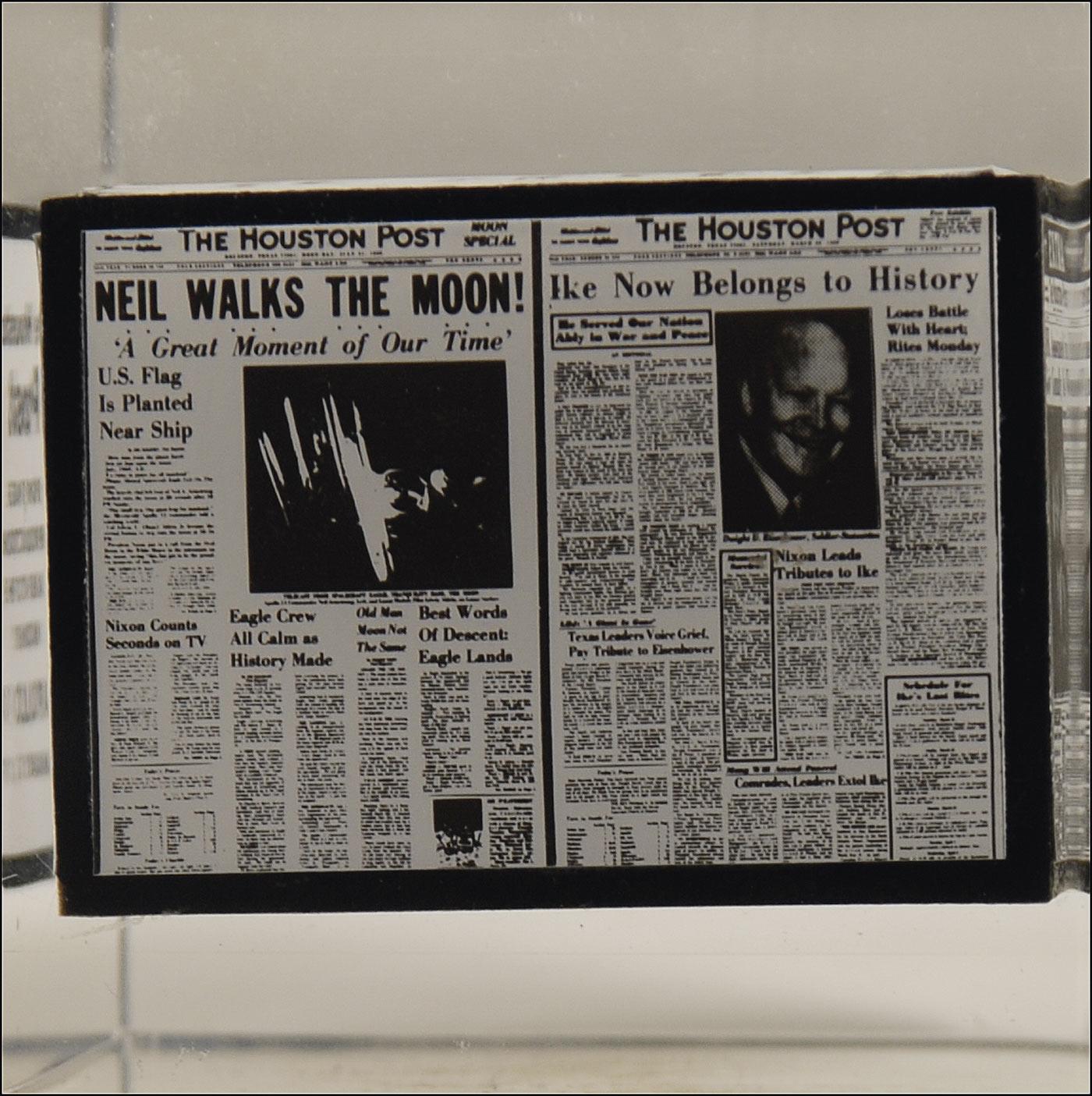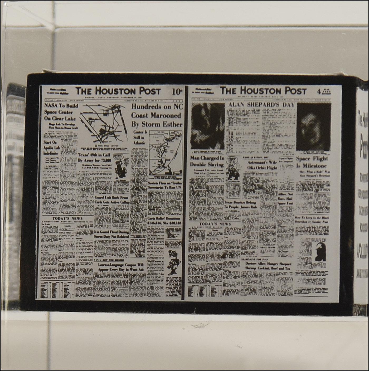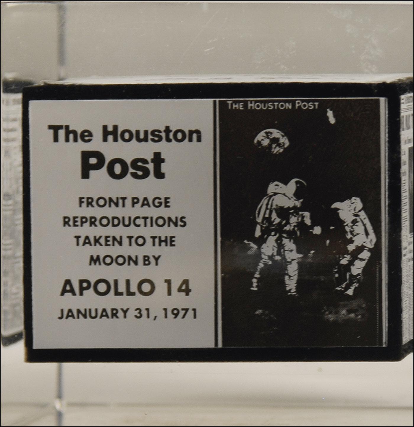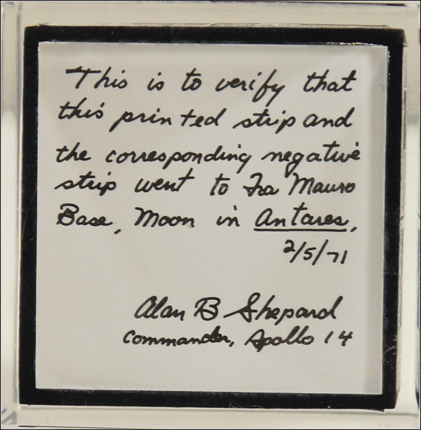 Flight-flown printed Houston Post headlines, flown to the lunar surface aboard the Apollo 14 Lunar Module, originally from the collection of Mission Commander Alan Shepard. Presented in a 2.5” Lucite cube is a printed strip of six Houston post headlines around the perimeter. The headlines include Dwight D. Eisenhower’s death, Armstrong’s moon walk, Kennedy’s assassination, and Shepard’s first flight. Top of the cube bears a copy of a handwritten letter of provenance from Shepard which reads, “This is to verify that this printed strip and the corresponding negative strip went to the Fra Mauro Base, Moon in Antares. 2/5/71. Alan B. Shepard, Commander, Apollo 14.” A unique lunar-flown item.