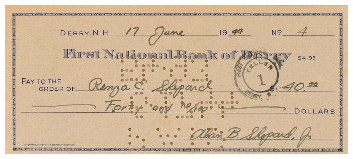 Bank check, 6.25 x 2.75, filled out and signed by Shepard, “Alan B. Shepard, Jr.,” payable to Renza C. Shepard for $40.00, June 17, 1944. In fine condition, with bank stamp to body and cancellation holes affecting first name of signature.