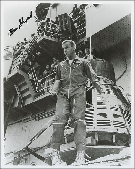 Glossy 8 x 10 photo of Shepard posing next to his Mercury capsule after his recovery, signed in black felt tip. In very fine condition.