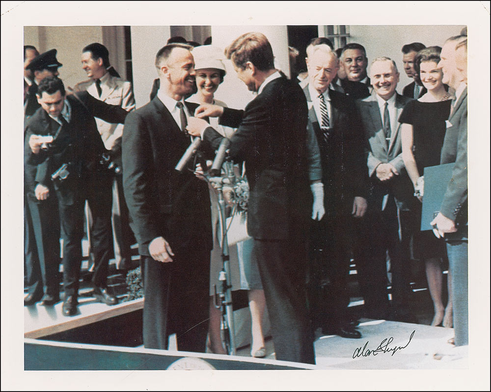Color 10 x 8 photo of President John F. Kennedy presenting the Distinguished Service Medal to astronaut Alan Shepard, signed in black ink “Alan Shepard.” In fine condition, with a few scattered light surface marks.