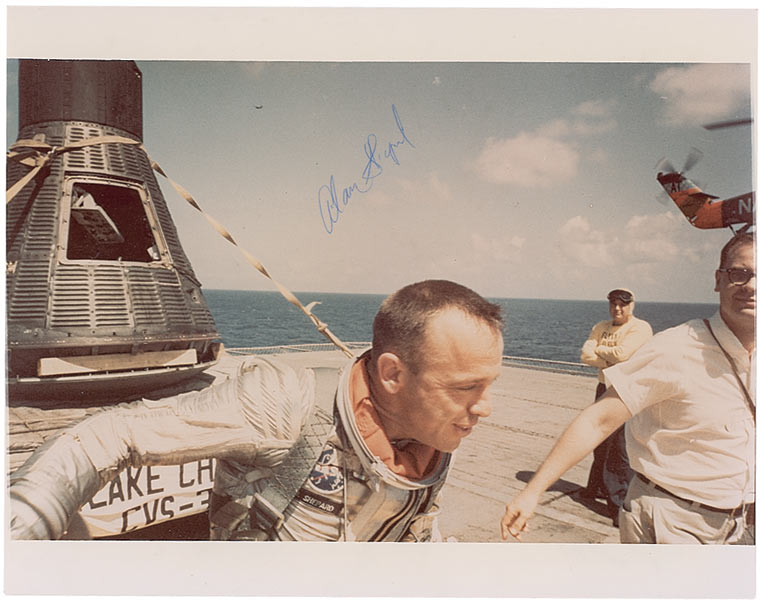 Color satin-finish 14 x 11 photo of Shepard on board the USS Champlain, his Freedom 7 capsule, secured on the deck behind him, signed in blue ballpoint “Alan Shepard.” Notation on reverse from the signature’s recipient reads, “Shepard Signature obtained personally by A J Cipriano at Mayflower Hotel June 26, 1979. National Space Institute Conference Wash D.C.” In fine condition, with a few trivial edge bends and creases, and light skipping to a single letter of signature.