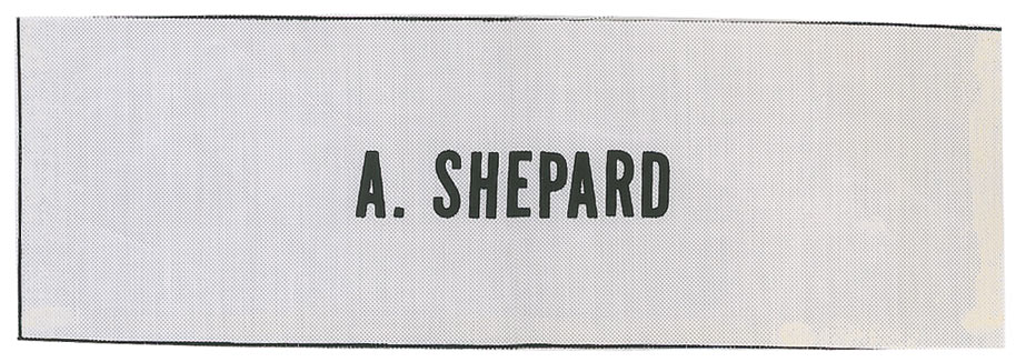 A 7.5 x 2.5 strip of beta cloth, bearing the printed name, “A. Shepard,” in the center. This piece may be a sample piece made by the technician before he actually placed the names on the space suits.