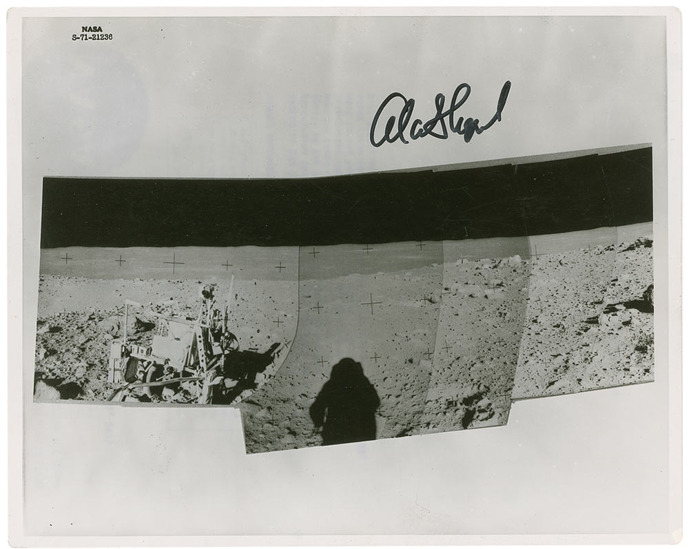Glossy 10 x 8 NASA panoramic photo of the Apollo 14 Fra Mauro landing site, signed in black felt tip. Scattered creases, surface marks, and impressions, otherwise fine condition.
