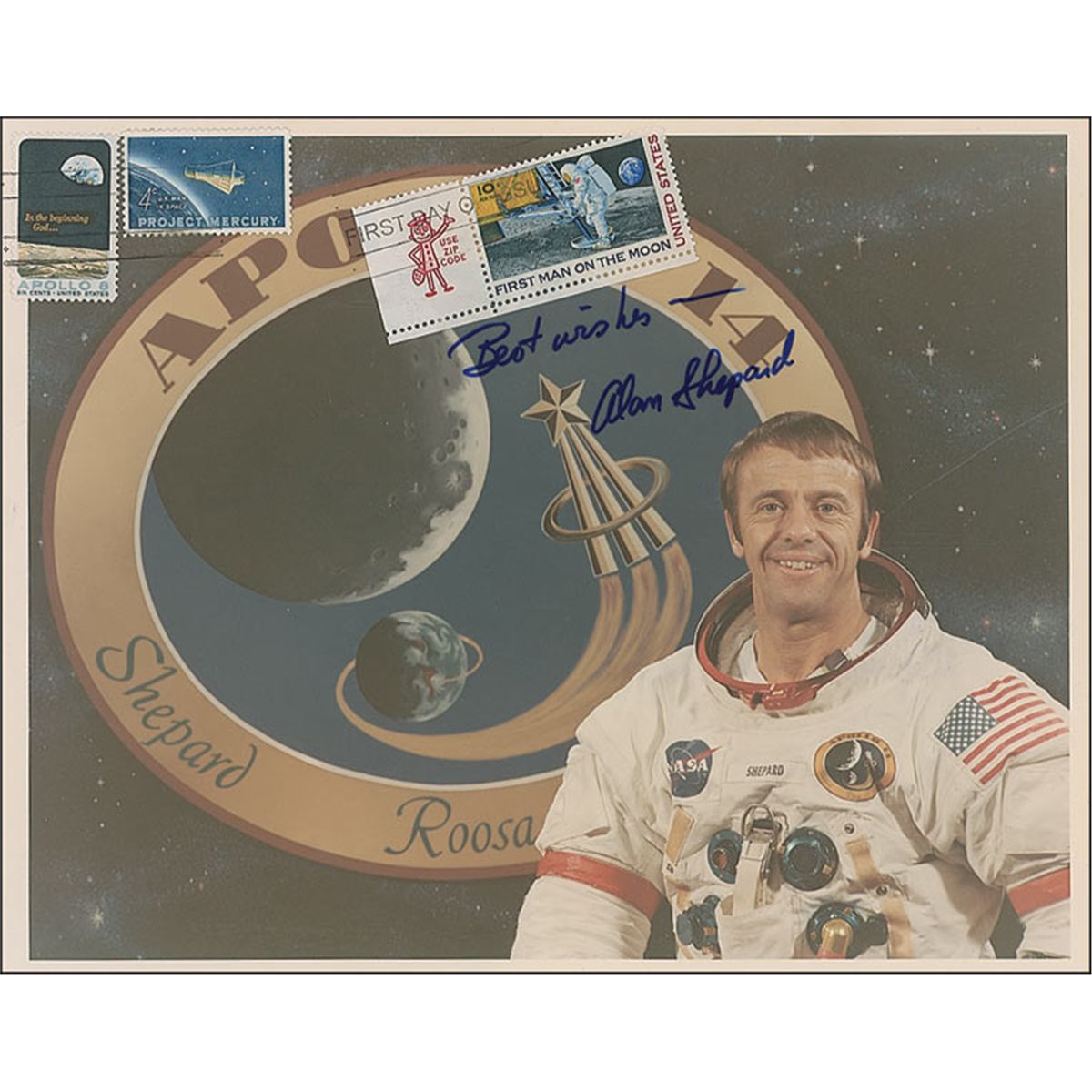 Very rare color satin-finish 10 x 8 NASA white spacesuit portrait of Shepard in front of the Apollo 14 insignia, signed in blue felt tip, “Best wishes—Alan Shepard.” There are three postage stamps affixed to photo, an Apollo 8 and Mercury stamp to top left, and a first man on the moon stamp to upper center, which may possibly be covering an inscription. All three stamps have cancellation stamps through them. In fine condition, with several horizontal surface marks extending from right edge through facial area, a few fingerprints, and aforementioned postage stamps.