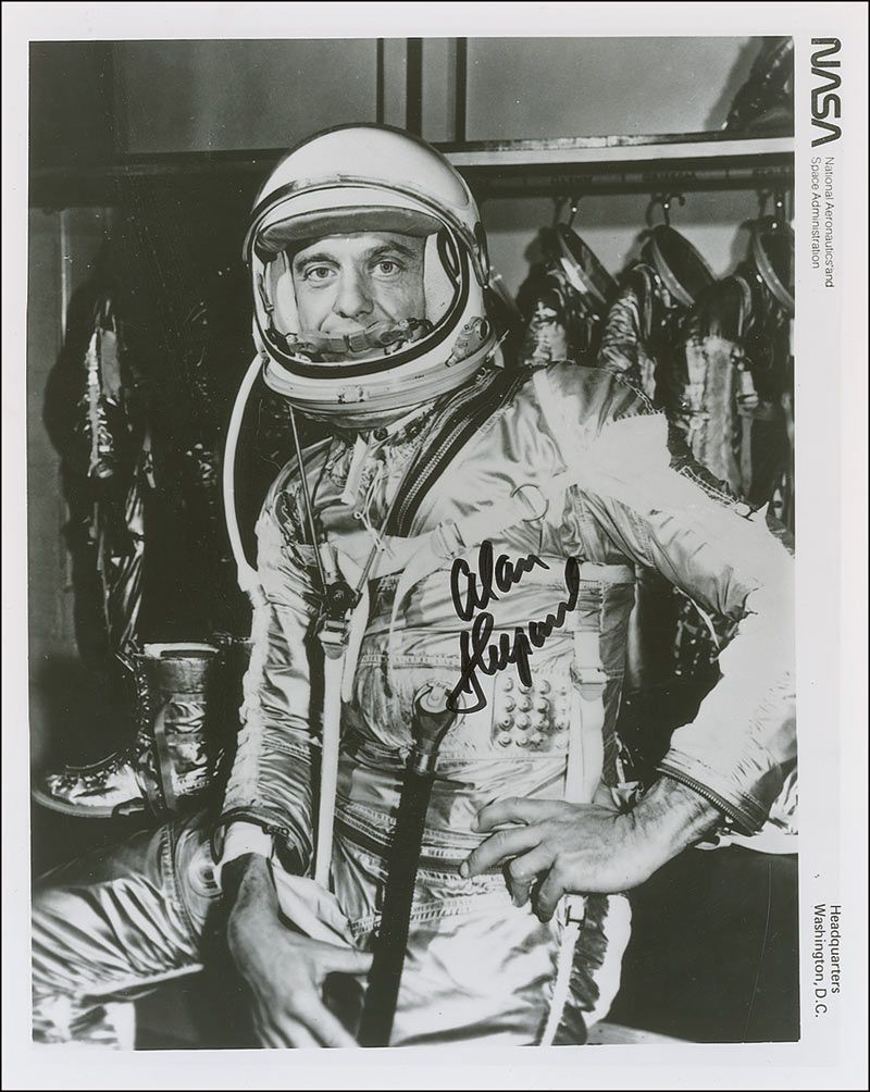 Glossy 8 x 10 photo of Shepard posing in his Mercury space suit, signed in black felt tip. In fine condition.