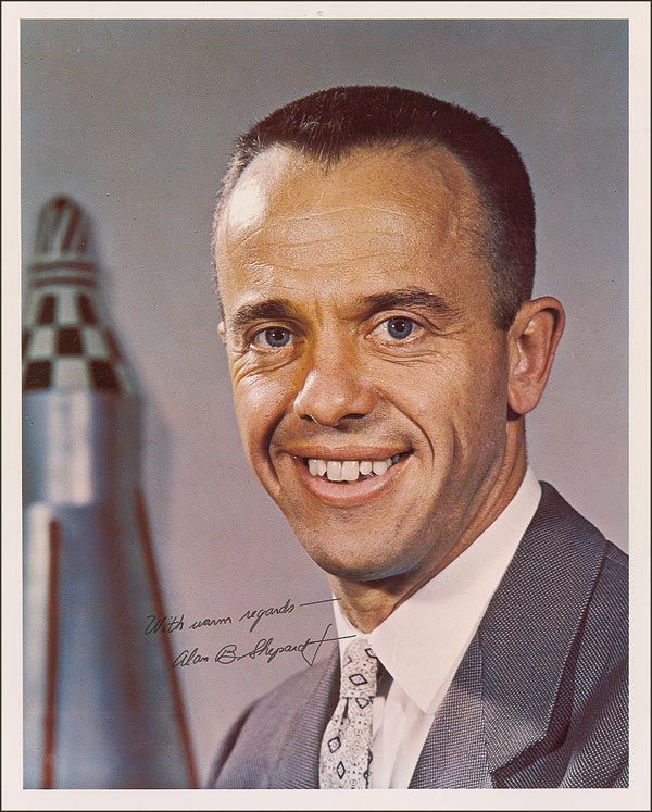 Vintage color 8 x 10 NASA head-and-shoulders photo, signed in black felt tip, “With warm regards—Alan B. Shepard, Jr.” In fine condition, with a single tack hole to top border, as well as a paperclip impression to top edge. Accompanied by a certificate of authenticity from James Spence.