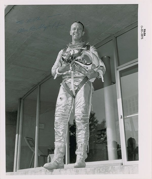 Vintage glossy 8 x 10 NASA full-length photo of Shepard standing outside in his Mercury flight suit, signed and inscribed in blue ballpoint “To Mother—Alan B. Shepard, Jr.” Moderate contrast to signature and inscription, otherwise fine condition.