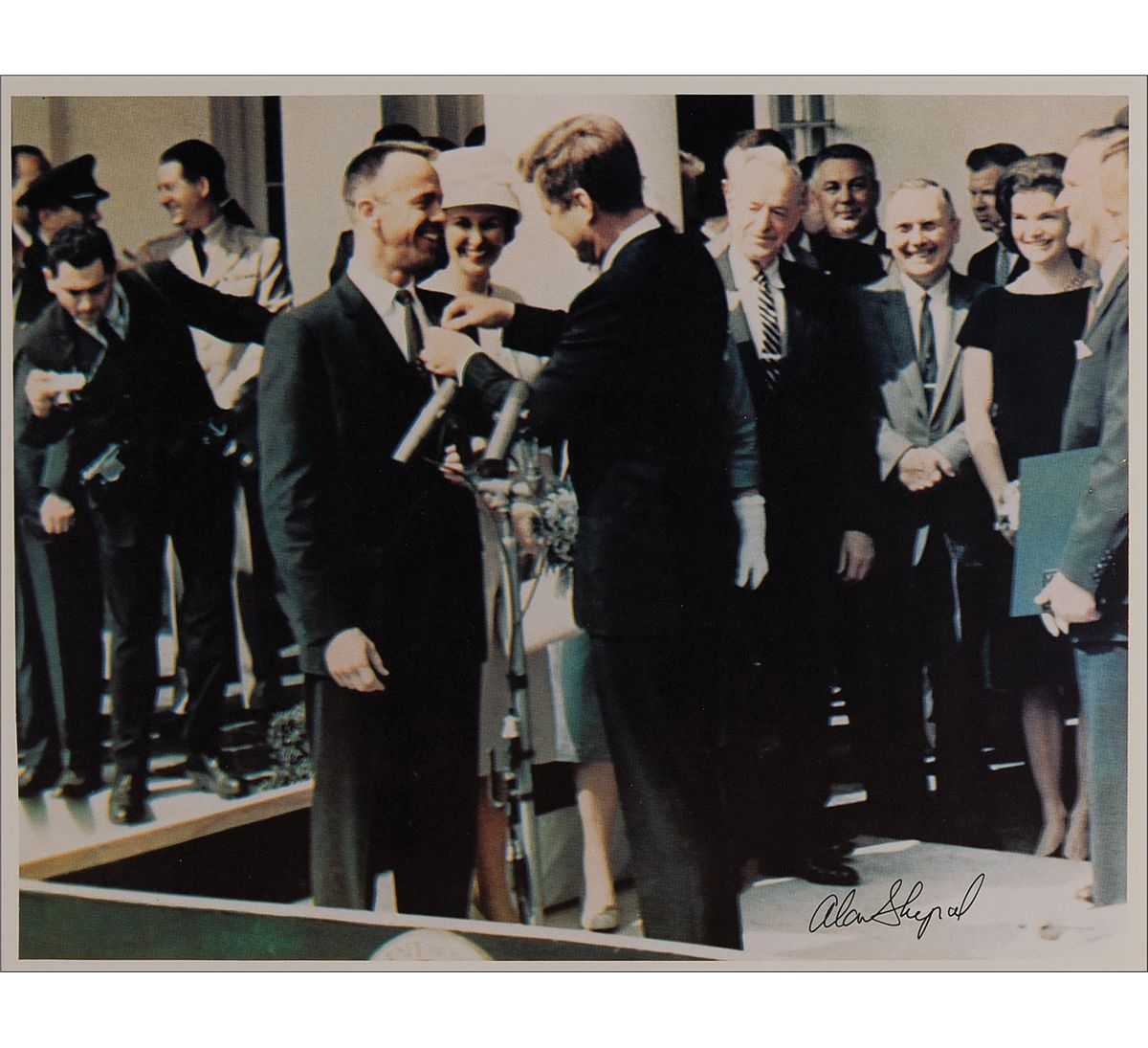 Distinguished limited edition color glossy 9.25 x 7.25 photo of Shepard receiving a medal from President John F. Kennedy, #1384/2500, signed in black felt tip by Shepard, and matted to an overall size of 14 x 11. In fine condition.