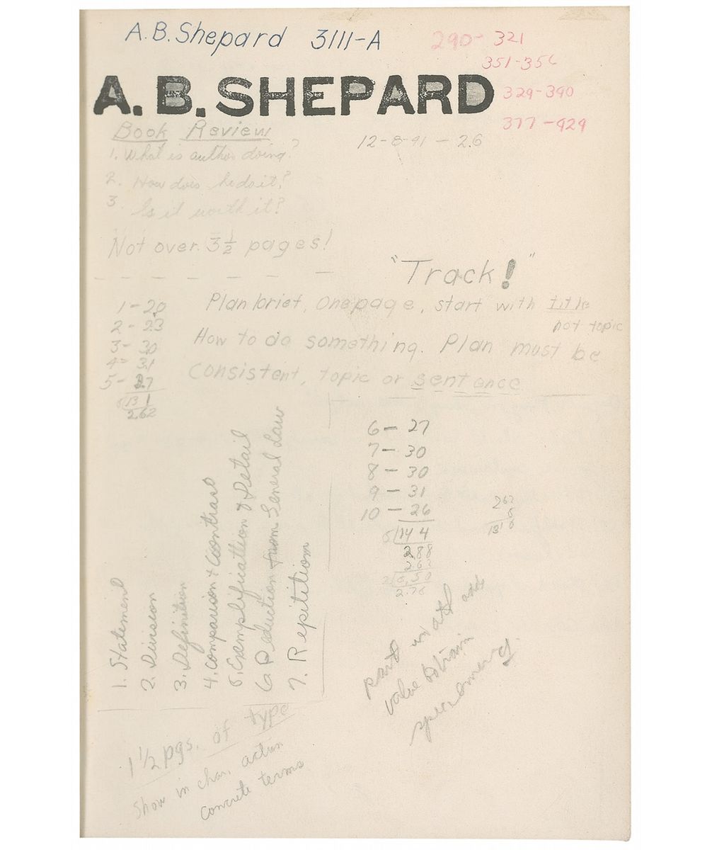 Ten items: two hardcover books: The Art of Composition, featuring Shepard’s name on the first free-end page, printed in blue ballpoint, “A. B. Shepard,” along with various pencil notations throughout the first two free-end pages, also in his hand; and We Hold These Truths, featuring the same printed name in blue felt tip; two vinyl-covered Watch Officer’s Guides from the United States Naval Institute in Annapolis, Maryland, one issued in 1935 and the other in 1941; a hardcover Physical Training Manual from the naval institute; a paperback Cruise Manual from the naval academy for the Practice Cruise, 1943; a paperback Touch Method Instruction Book on Remington Typewriters; a vinyl copy of The Physics of Aviation: An Elementary Text on the Theory of Flight; and two paperback Annual Registers of the United States Naval Academy, one for the years 1941–1942, and the other for 1942–1943. In very good condition, with scattered light toning, creasing, and the expected wear. These books come directly from Alan Shepard’s estate in Derry, NH.