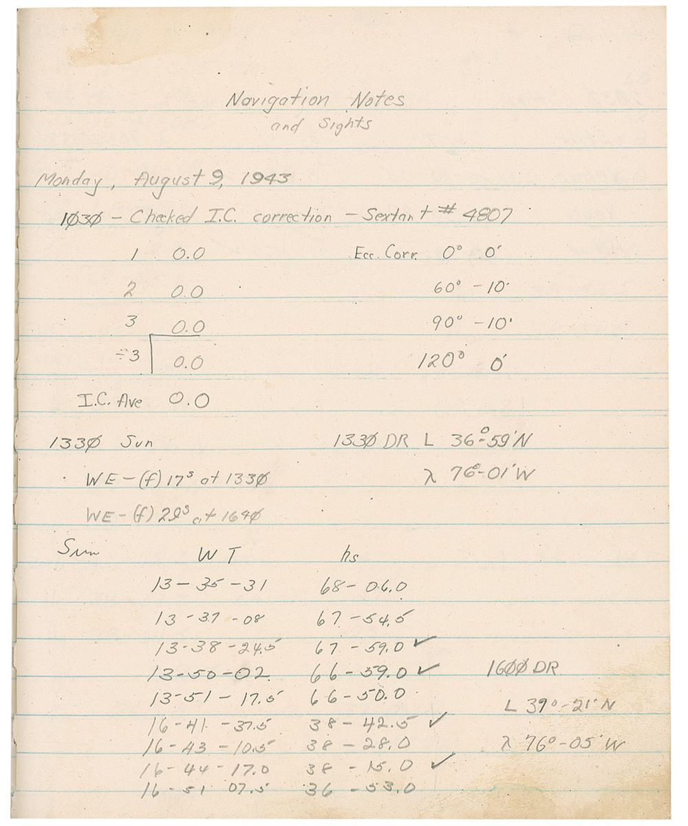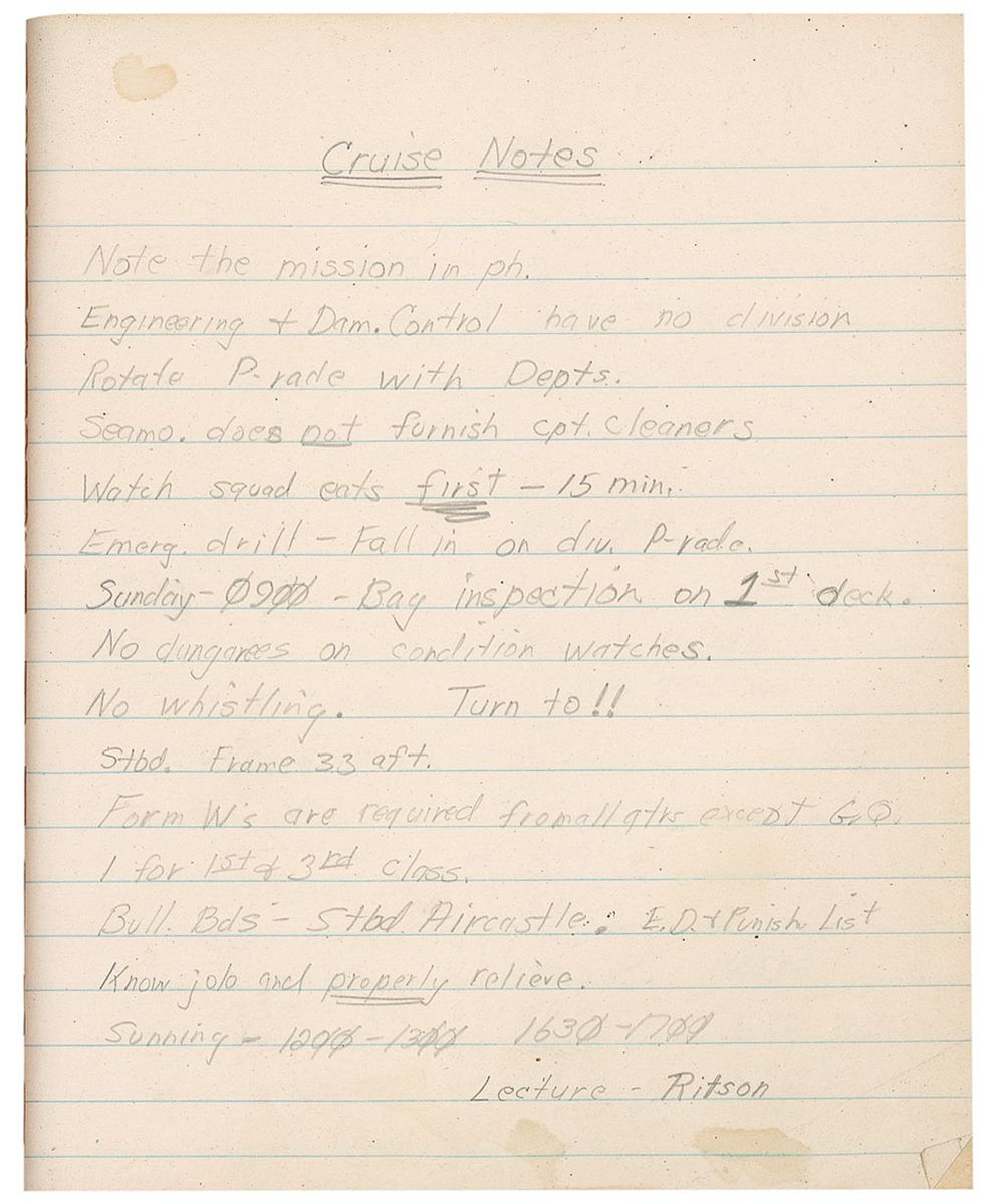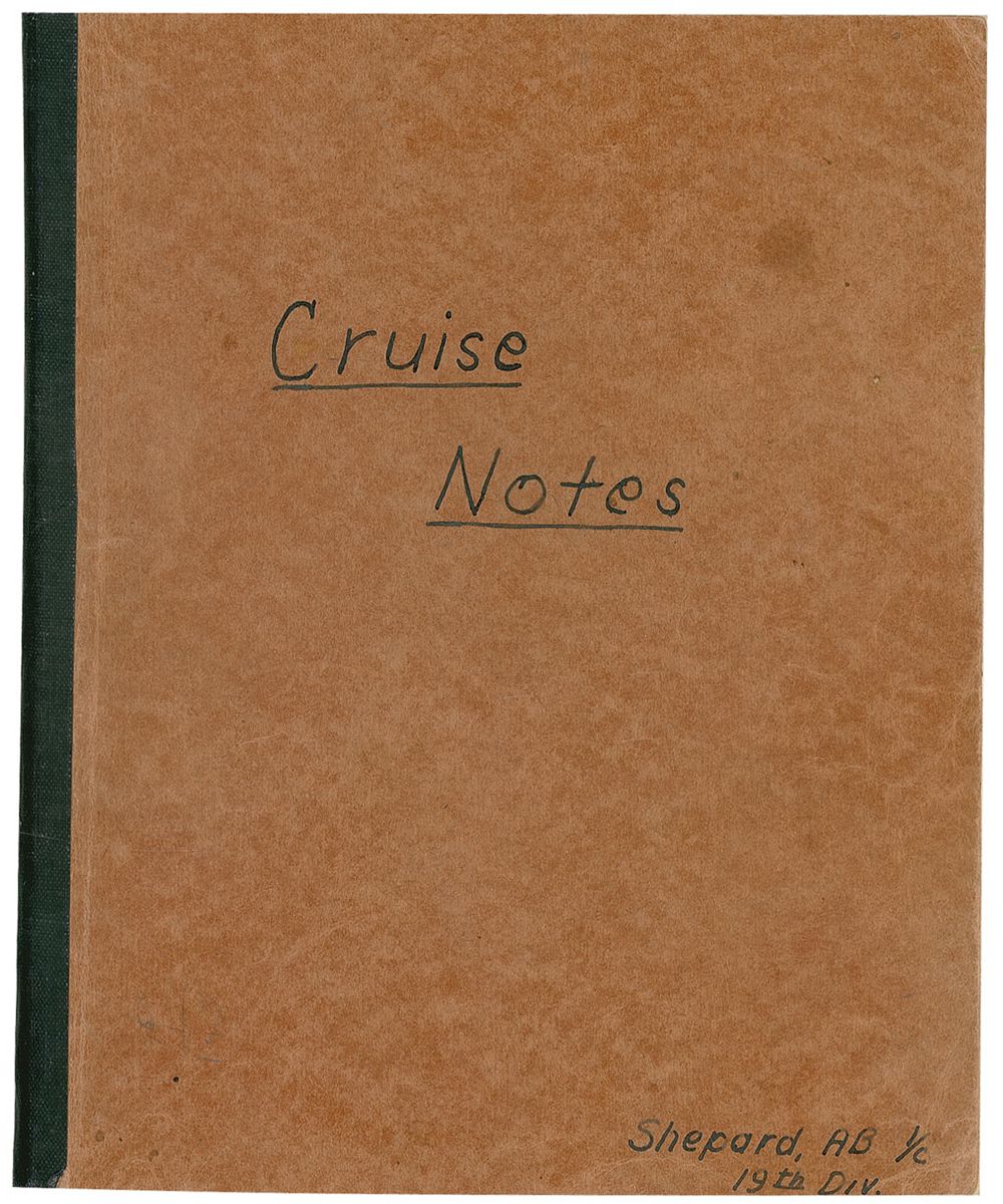Soft cover notebook entitled ‘Cruise Notes, Shepard, AB 1/c, 19th Div.,” 7 x 8.5, bearing a printed black felt tip signature to the bottom right corner of the front cover, “AB Shepard, 19th Div.” The first 14 pages contain handwritten notes by Shepard in pencil during August of 1943, containing calculations, radio and steam formulas, diagrams, various locations of stars and celestial bodies through varying times of the day, and several pages of information pertaining to equipment operations, requirements, functions, and factors, including, “Quality for gas measured by: (1) Volatility, (2) Heating value, (3) Lack of impurities, (4) Octane number...Conditions influencing detonation: (1) Chemical composition of fuel, (2) Compression, (3) Temperature, (4) Time of ignition, (5) Shape of the combustion chamber, (6) Location of plug.” Light creasing and toning, and light wear to the cover, otherwise fine condition. This notebook comes direct from Alan Shepard’s estate in Derry, NH.