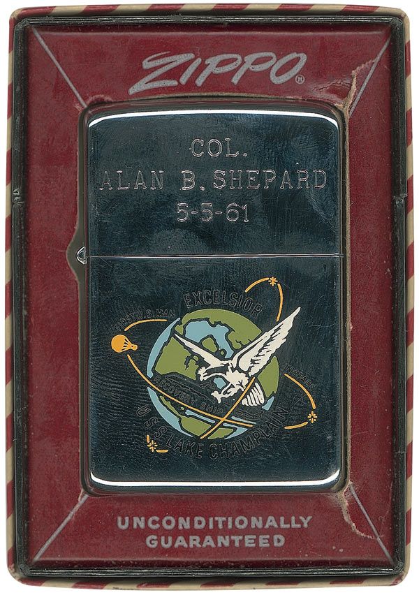 Shepard’s personally owned commemorative Zippo lighter in honor of his historic space flight. Lighter is engraved on the top, “Col. Alan B. Shepard, 5-5-61,” with an image on the lower portion honoring the recovery ships as well as Shepard being the first American in space. Lighter does not appear to function, but comes in its original box. Originally acquired by a friend of the Shepards who was in the employ of the Shepard family for more than 35 years. In fine condition.