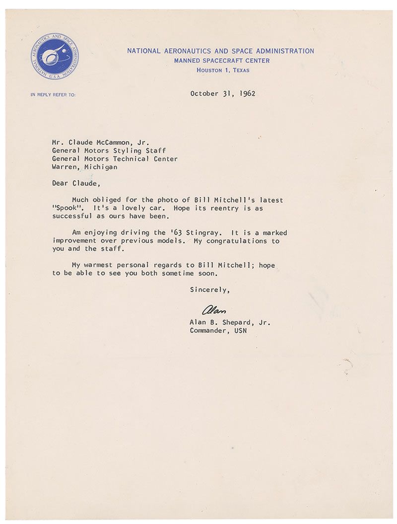 TLS signed “Alan,” one page, 8 x 10.5, NASA Manned Spacecraft Center, Houston, Texas letterhead, October 31, 1962. Shepard writes to Claude McCammon, Jr. of the General Motors Styling Staff in Warren in full: “Much obliged for the photo of Bill Mitchell’s latest ‘Spook’. It’s a lovely car. Hope its reentry is as successful as ours have been. Am enjoying driving the ‘63 Stingray. It is a marked improvement over previous models. My congratulations to you and the staff.” Light creasing and a faint staple mark to the top left corner, and a trivial stray mark, otherwise fine condition.