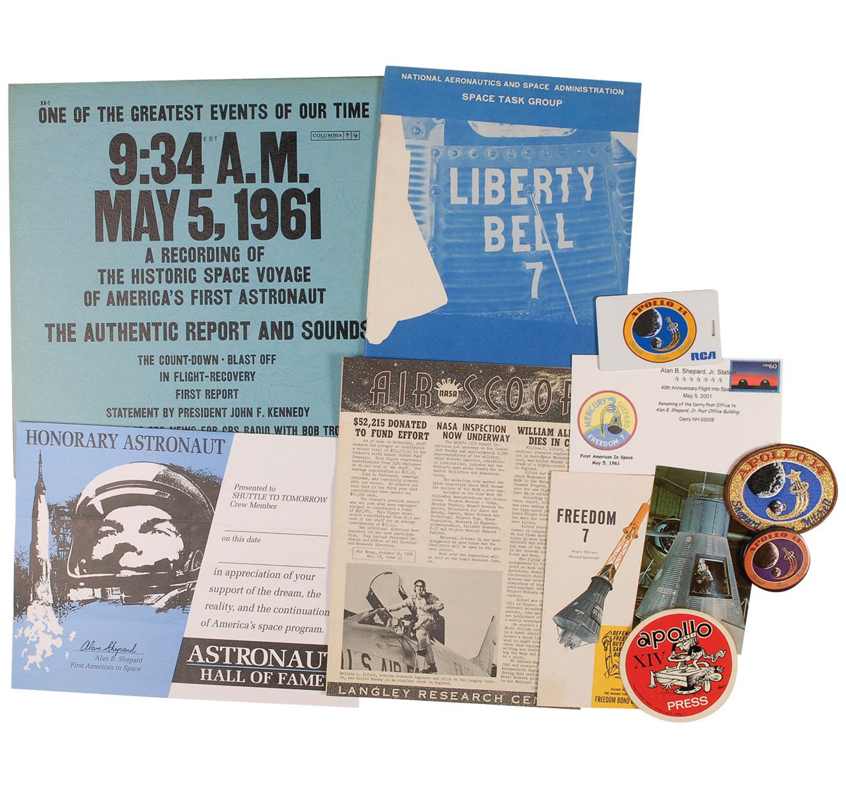 Collection of 11 items relating to Shepard’s space career, all obtained by a family friend of the Shepards who was in the employ of the Shepard family for more than 35 years. Items include: a Liberty Bell 7 booklet issued by NASA’s Space Task group; an unissued honorary astronaut certificate, bearing a printed signature; an Apollo 14 ‘press’ sticker; a souvenir Apollo 14 mission patch; an Apollo 14 button; a Freedom 7 war bond pamphlet; and an album of the recording of Shepards space flight issued by CBS News. In fine overall condition.