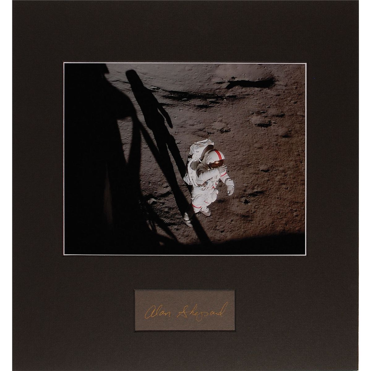 Gold ink signature on a black 4 x 1.75 card. Matted with a color glossy photo of Shepard on the moon, to an overall size of 14 x 15. In fine condition.